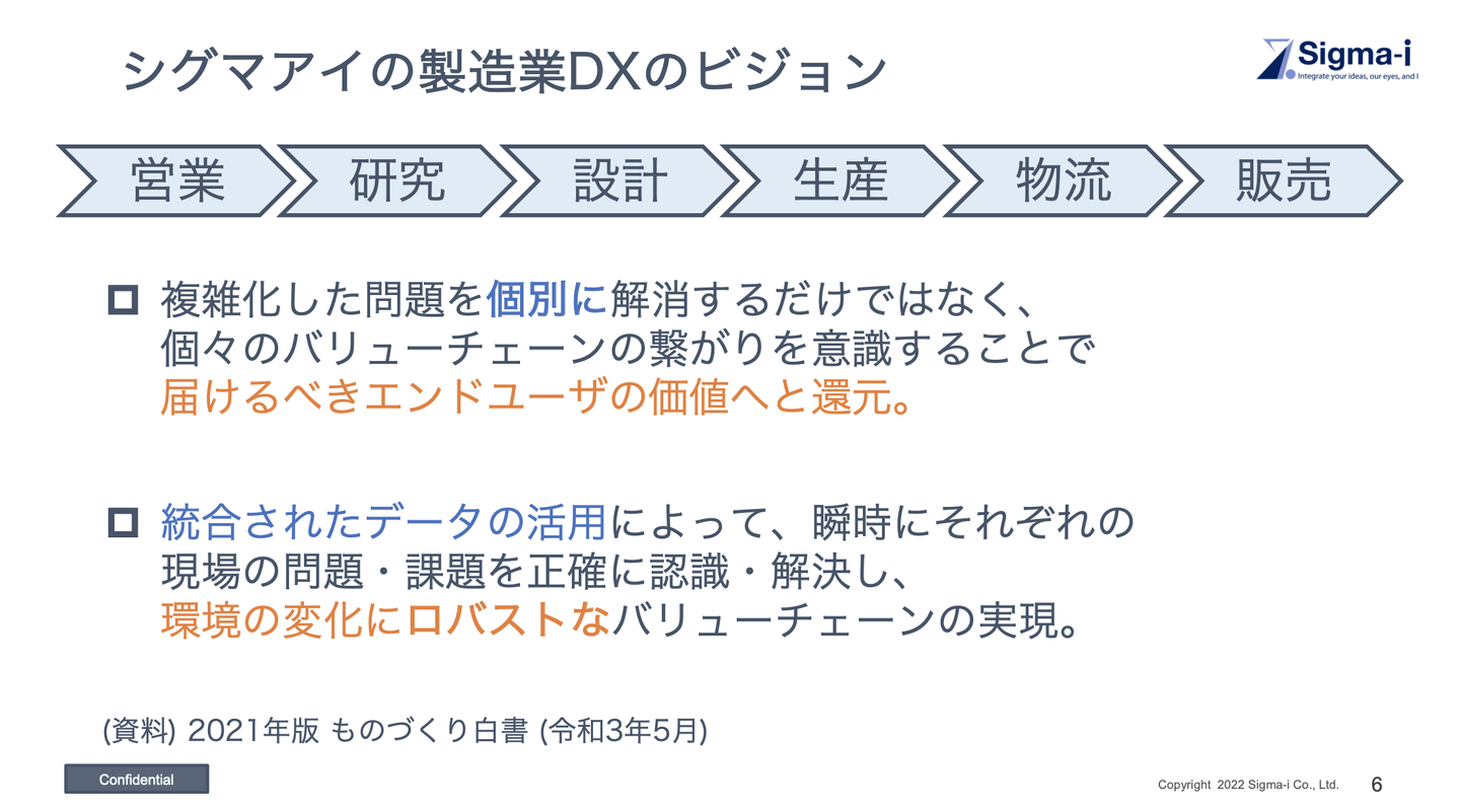 製造業のバリューチェーンは、このように営業から販売までつながっていて、ユーザーに製品を届ける仕組みになっています。それぞれの工程を解決するのではなく、つながりで捉えて全体を解決するソリューションです。シグマアイの技術や頭脳を活かして、統合されたデータを活用して、現場の課題を正確に認識して解決していく。加えて、コロナ禍やウクライナ情勢など、環境の変化が激しい時代において、その変化にも対応できるバリューチェーンを実現したいと考えています。