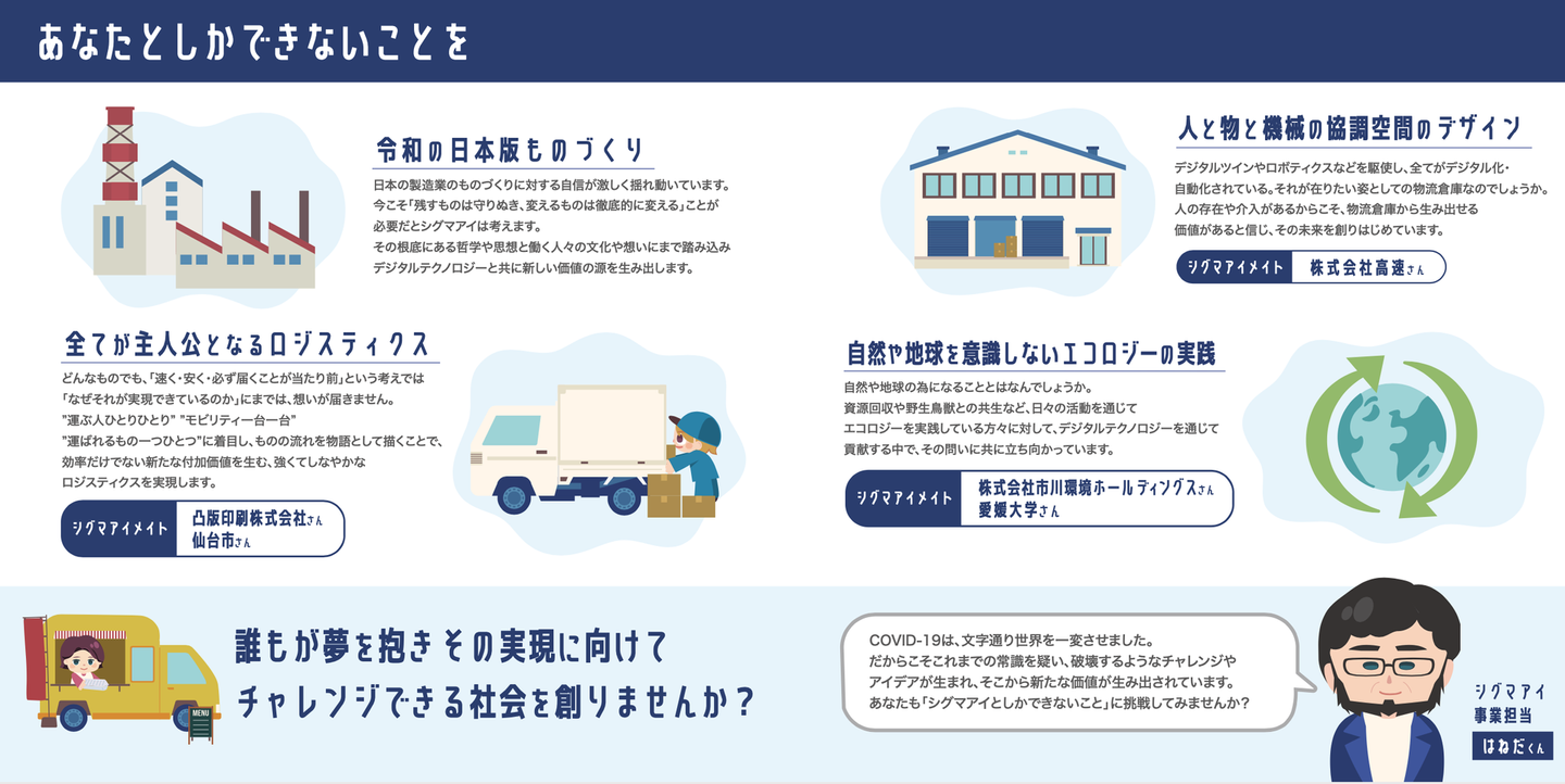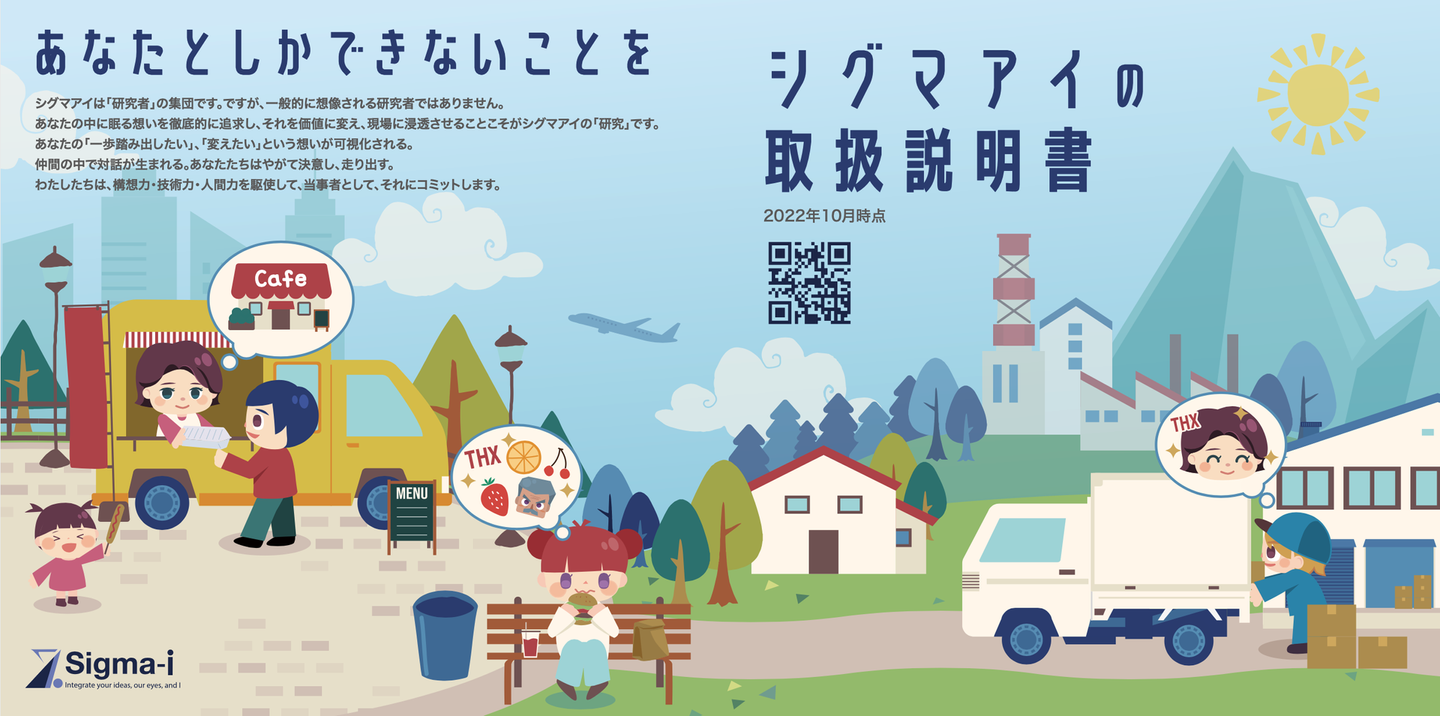 表紙はイラスト調でシグマアイが描きたい未来を表現しました。シグマアイが既にソリューションを提供している物流や製造業をイメージしました。会社の説明部分も、一般的な「会社概要」のような固い感じではなく、プロダクトや取引先をキャッチーに表現。量子技術を活用したソリューションの源になる「マシンタイム」にも触れています。そして、コアメッセージ「あなたとしかできないことを」を大きく載せて、シグマアイと実現できる未来をイラストともに伝えました。
