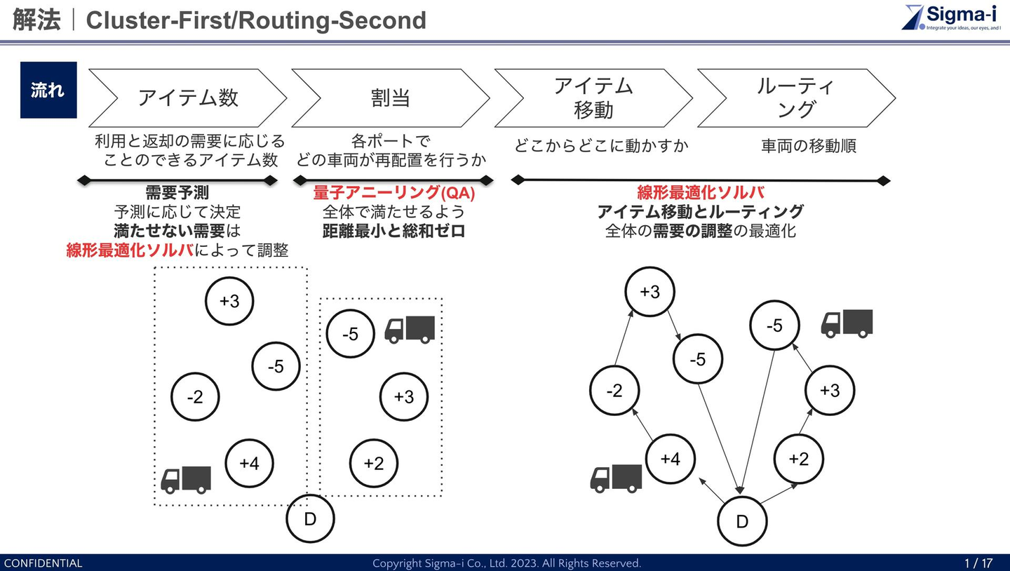 そこからは、「シェアリングサイクルの最適化」にフォーカスして、ソリューションの中身を詰めていったのですが、一つの壁にぶつかりました。「各ポートでどの車両が再配置を行うのか」は、量子アニーリングで最適化できるのですが、「アイテムをどこからどこに動かすのか」「車両の移動順序はどうするのか」という問いには、あまり相性が良くなかったのです。何度も試行錯誤を繰り返した末に、「線形最適化ソルバ」という新しい解法を用いることで、何とか乗り越えることができました。