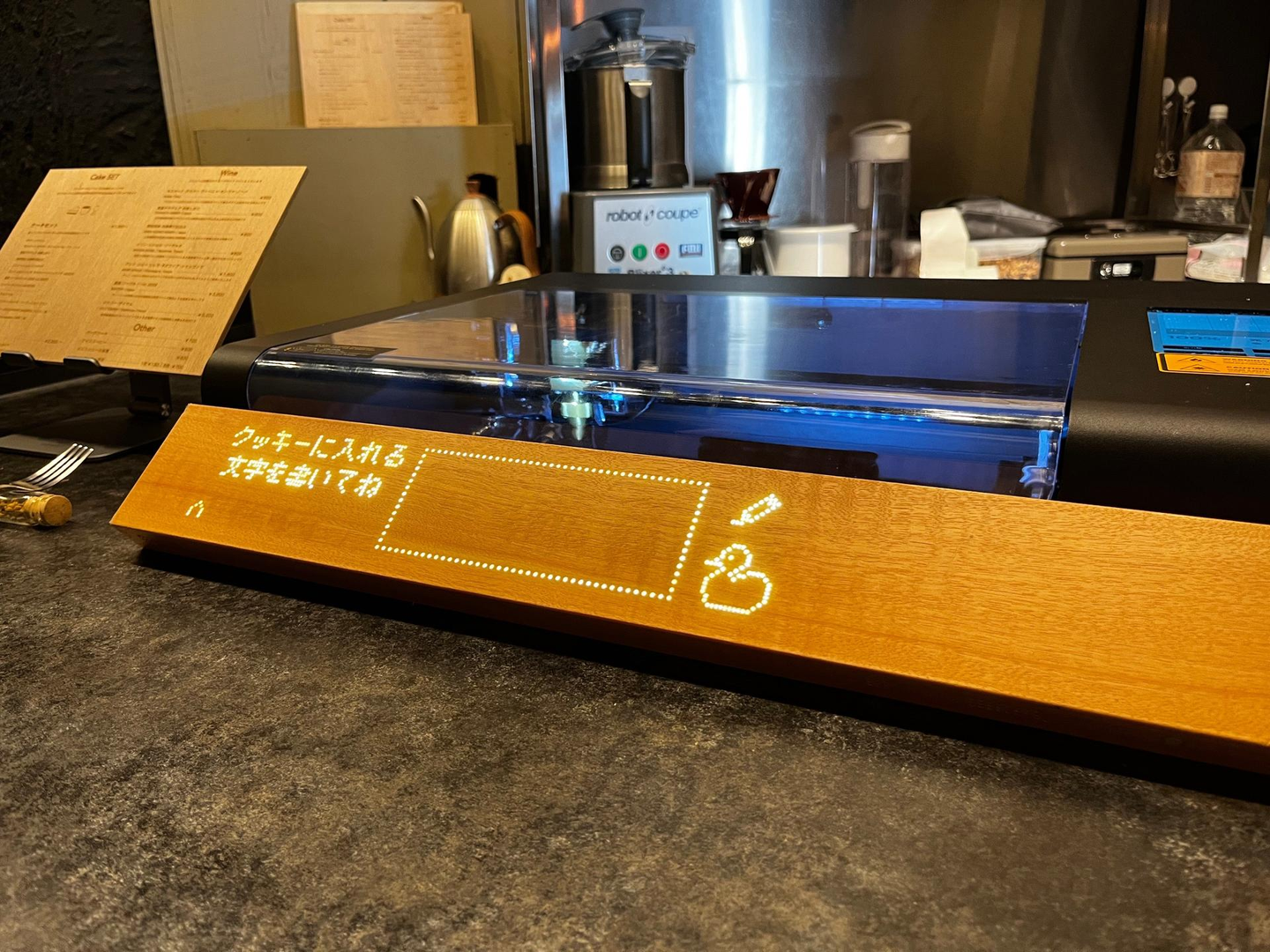 各席にあるmuiボードの枠内に文字を書くと、その人の筆跡の通りにデータがレーザー加工機へ転送され、クッキーに彫刻されるという、テクノロジーを使った他では味わえない体験ができます。