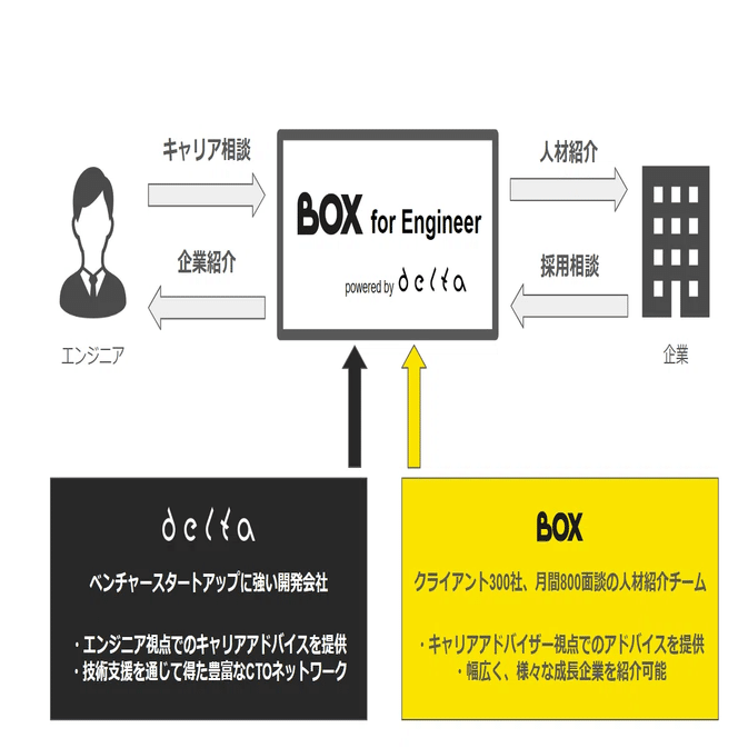 具体的には、技術スキルの訴求方法や、今後経験したい業務など、専門的な相談をDELTAのエンジニアが担当。一方で、どんな働き方やライフスタイルを希望するのかなど、普遍的なキャリア相談をBOXが承る。それぞれの組織の強みを活かすことで、挑戦するエンジニアのキャリア支援が実現できています。