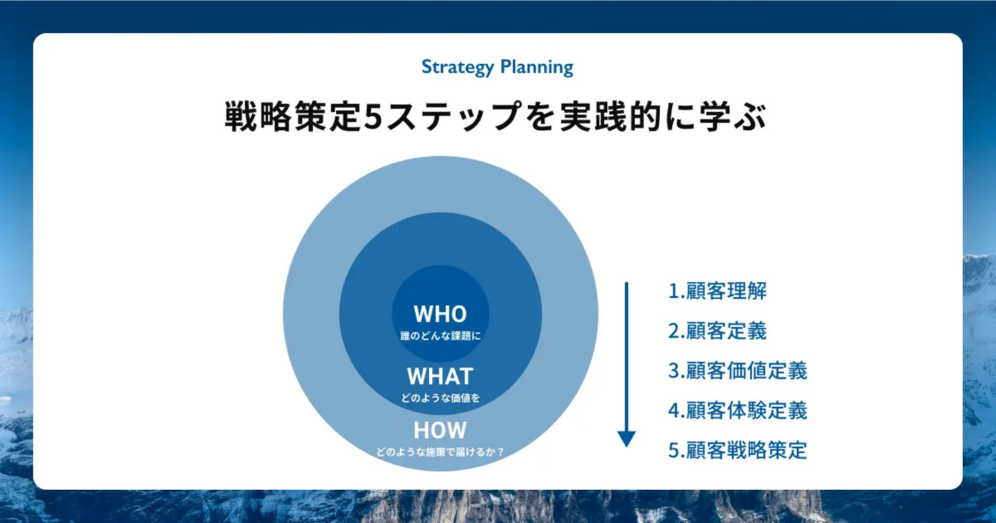 講義では、マーケティング戦略「WHO/WHAT/HOW」について、実際にマーケティング専門家陣が数十社のマーケティング戦略策定支援で活用している「Marketing 5OS」を通じて体系的に学びます。