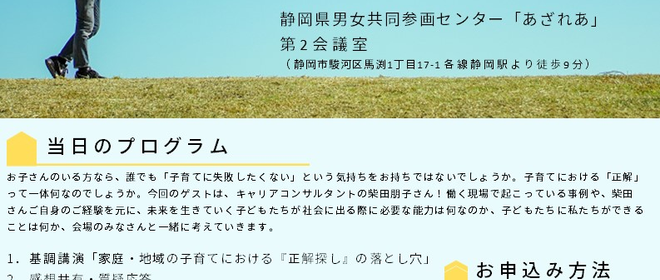 『家庭・地域の子育てにおける「正解探し」の落とし穴~キャリア教育の観点から~』2022.7.24(SUN) 14:00~16:00 静岡県男女共同参画センター「あざれあ」第2会議室         (静岡市駿河区馬渕1丁目17-1 各線静岡駅より徒歩9分)今年も静岡でもキャリア教育コーディネーター育成研修を開催します!!名古屋会場は、少し遠いけど、静岡なら通える、秋以降の日程ならと思った方は、ぜひこちらに。ただ、今回も育成研修に必須参加ではなく、静岡に柴田朋子さんがいらっしゃいます!!企業研修等で知る人ぞ知る東海エリアでは有名講師です。企業人のキャリア開発だけでなく、子どもたちの支援にも...
