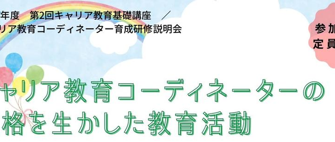 2022年度 第2回キャリア教育基礎講座 / キャリア教育コーディネーター育成研修説明会「キャリア教育コーディネーターの資格を生かした教育活動」~・~・~・~・~・~・~・~・~・~・~・~・~・~・~みなさんは、「キャリア教育コーディネーター」について知っていますか?キャリア教育コーディネーターは、学校と地域をつなぎ、キャリア教育の支援をおこなうプロフェッショナルです!学校内外で活躍するキャリア教育コーディネーターの方にお越しいただき、これまでと現在の活動の実情、これからの展望などを語っていただきます!~・~・~・~・~・~・~・~・~・~・~・~・~・~・~【日時】2022年6月25...