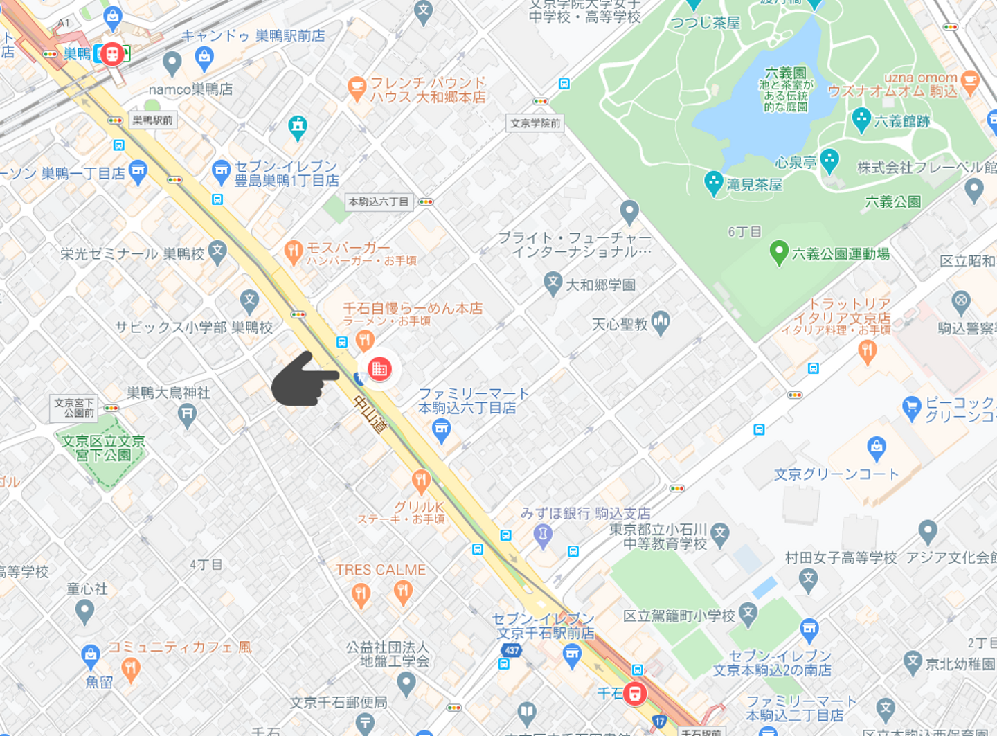 最寄り駅はJR巣鴨駅または都営三田線 千石の駅になります。ラーメン好きな方には千石自慢ラーメンの隣のビルと伝えるとすぐに理解していただけます。会社の近くで私が好きな場所は枝垂桜が有名な「六義園」です。都内とは思えない緑豊かな場所なので年間パスを毎年購入しています。