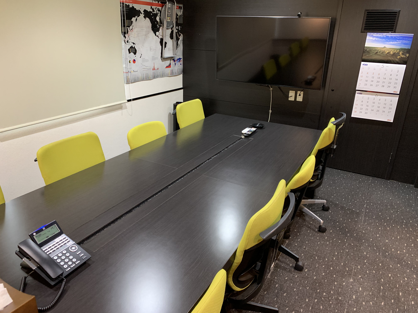 入口から直ぐに会議室があり、社外の方との会議はこちらで行う事が多いです。外からよく見えるのですが会議の内容によっては電動カーテンを使い外部から見えないようにします。