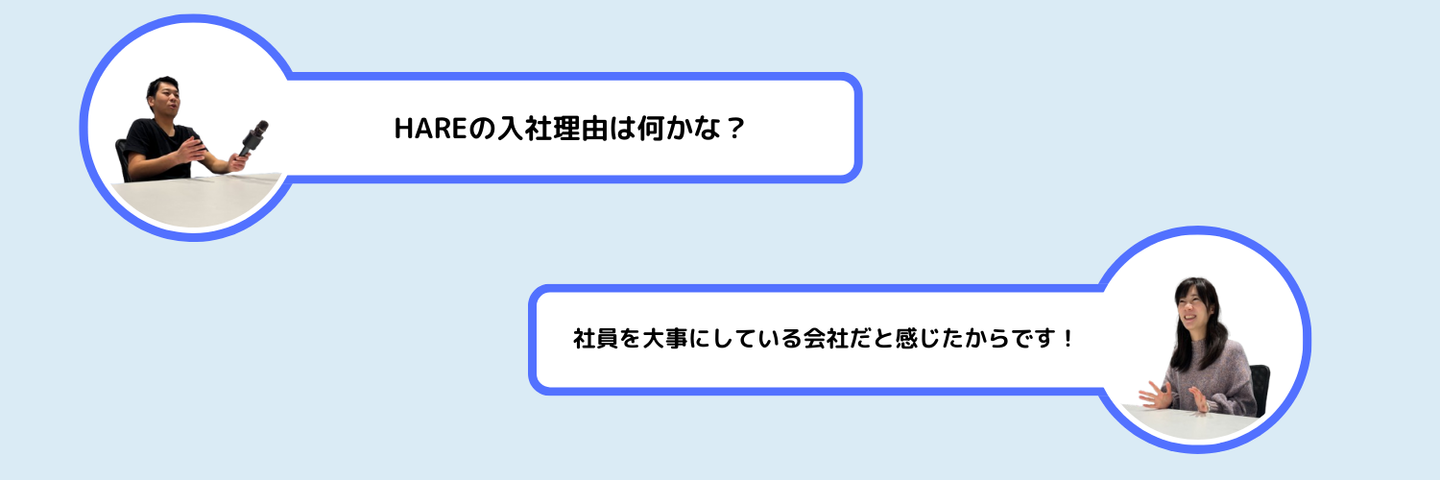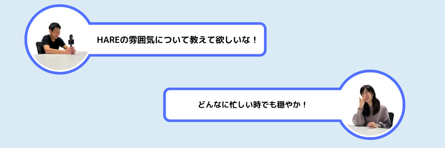 そんな中、飲み友であり親しくさせていただいていた社長にお声がけいただき、その社長の会社に営業事務として転職をしましたが、親の介護の必要が出てきたタイミングで一度退職をさせていただきました。その後状況が落ち着き、仕事探しを仕切り直した時に自身の転職軸を改めて見つめ直すと、プライベートでも仕事でも無意識に聞くポジションになっており、自分なりの体験を踏まえたことを伝えると、ふいに感謝されることが多いことに気づきました。そこで一度新卒就職の際に頭をよぎった人材業界に焦点をあてて転職活動を始め、HAREへ転職!そして現在です!