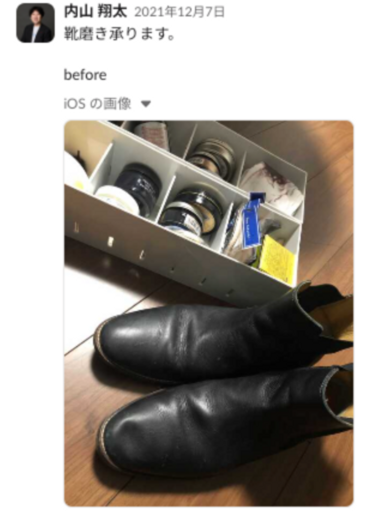 このインタビューを受けて、過去いい靴磨きの画像ないかなと探っていたら、入社してすぐ靴磨きをslackでアピールしてました。笑