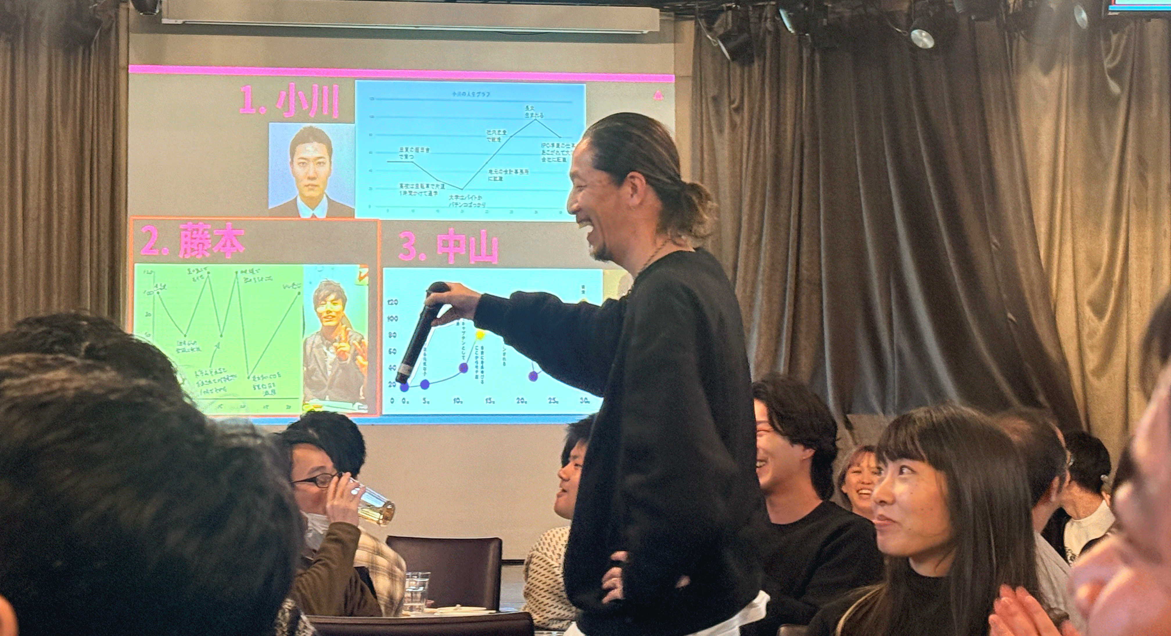 「この人生チャートは誰のものか!?」を当てるクイズでは、メンバーの若かりし写真も出て、終始大盛り上がり!普段の業務では見られない一面が見られるのも忘年会ならではの醍醐味です。