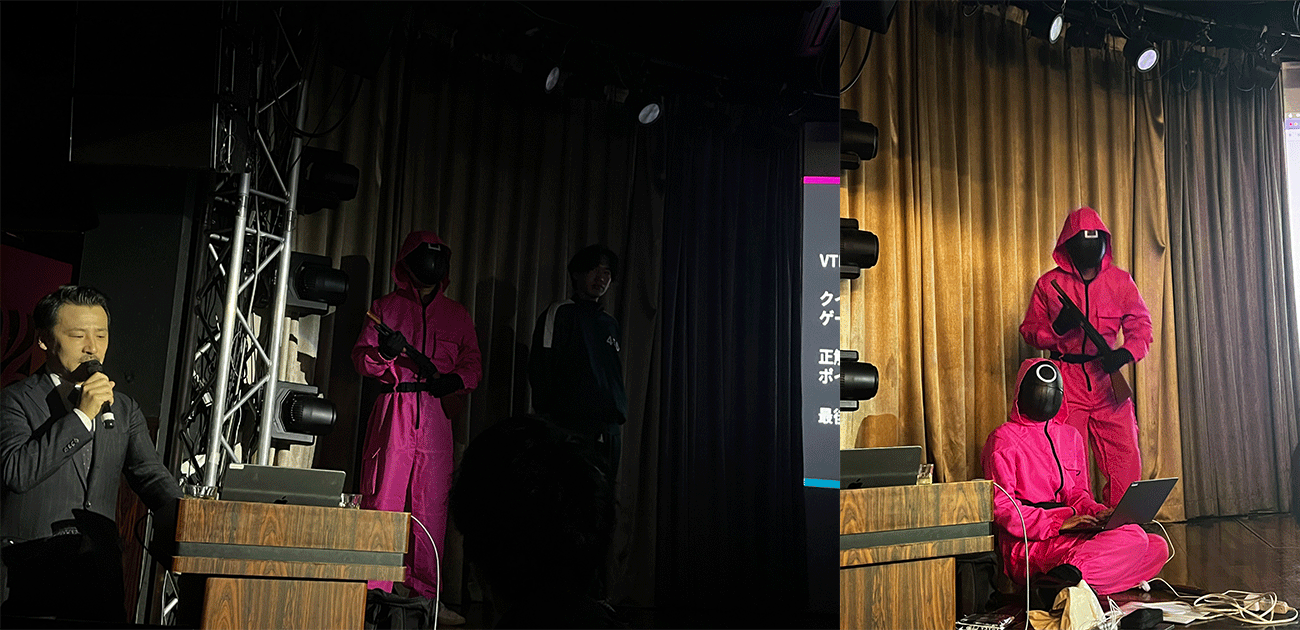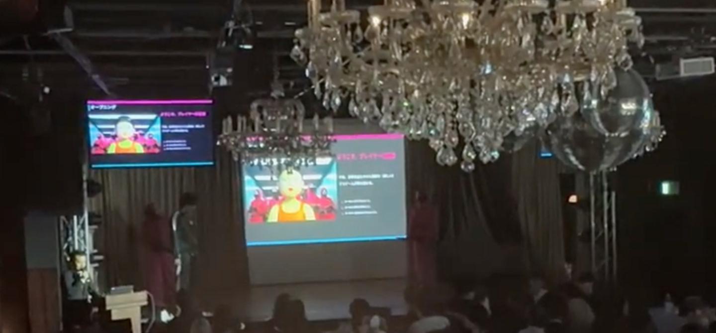 忘年会開始とともに会場が暗転し、スクリーンに映し出されたのは、どこかで見覚えのある不気味でスタイリッシュな映像……。 なんと、話題をさらった「イ◯ゲーム」を模倣したオリジナルオープニング映像です!
