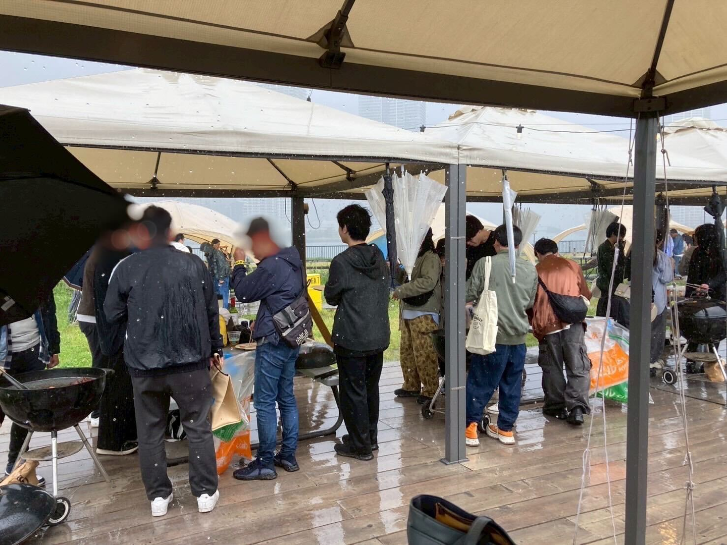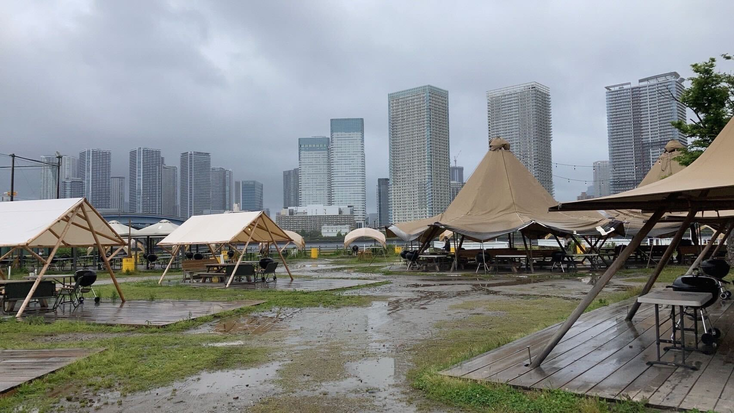 田んぼのような地面、テントの合間から流れる雨、横殴りの風、中々着かない火…