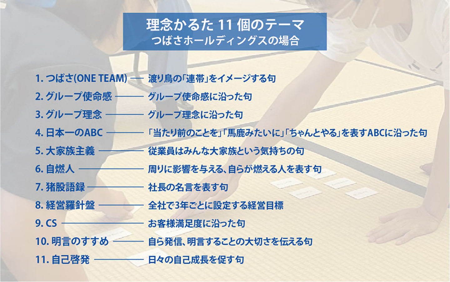 会社の理念は「つばさレシピ」という新書サイズの冊子にまとめられています。全従業員が携帯するこの冊子をもとに、かるた全44句を構成する11個のテーマ決めをしました。テーマ決めの最終MTGには、社長と取締役、社風人財開発グループマネージャーも参加しました。