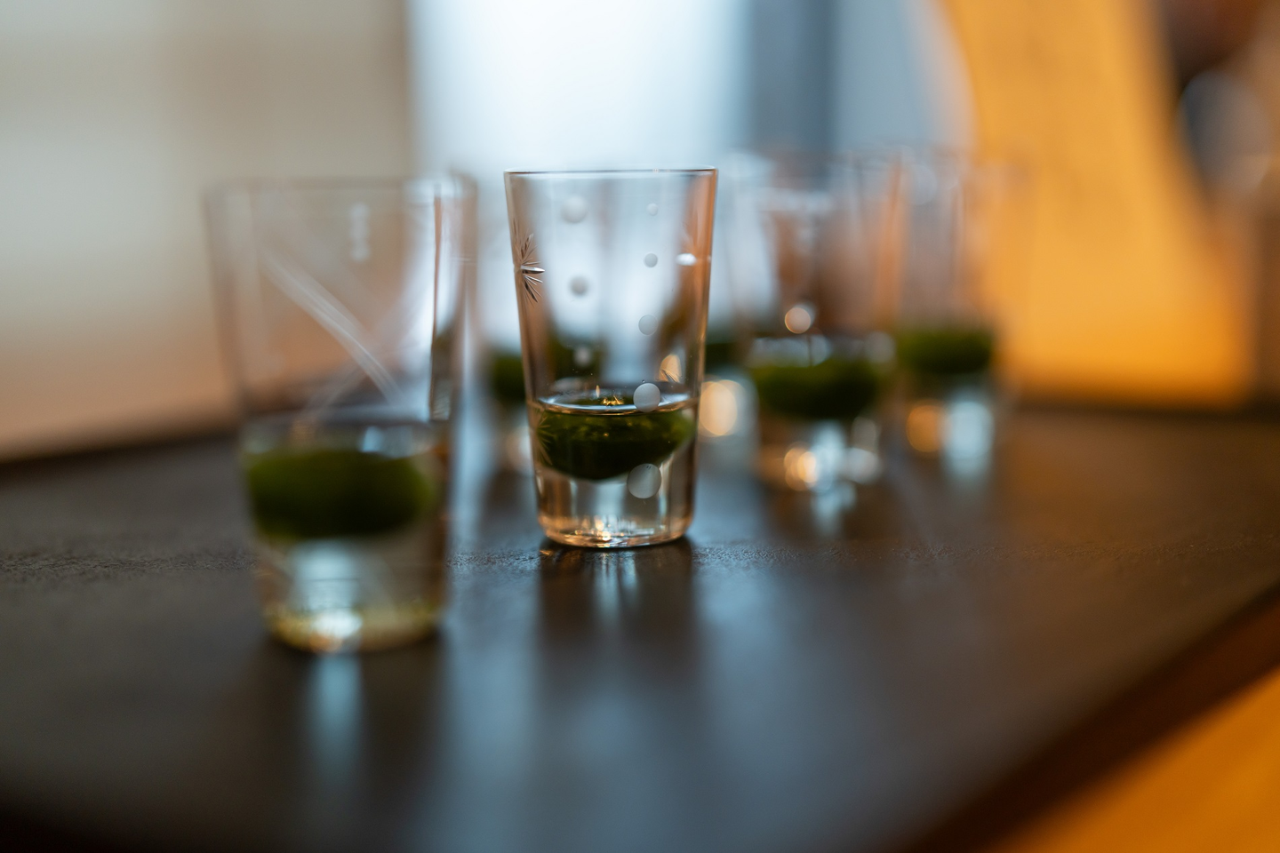 昨年の最優秀賞は、その名も「濃茶玉(こいちゃだま)」。皆さまは「濃茶」をご存じでしょうか?一般的に飲まれている抹茶は、薄茶(うすちゃ)といい、その2倍、抹茶を使用したものを「濃茶(こいちゃ)」と呼びます。少量の湯で抹茶をとくため、トロリとした食感の、贅沢で重厚感ある味わいになります。現代の暮らしの中では、この「濃茶」を味わう機会は、めったにありません。そのため濃茶の美味しさを、もっと多くの方に知ってもらいたい!そんな想いから生まれた、”濃茶を球体に固めツルっと食べられる”というアイデアです。