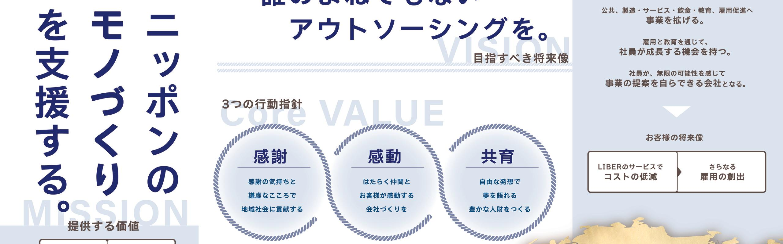 「誰のまねでもないアウトソーシングをつくりたい。」 そうした想いから、LIBERは誕生しました。 これまでの人材サービスは、即戦力を表面上で求めるあまり、 働く人の成長や、企業の本質的な課題解決が置き去りにされがちでした。 「感謝」「感動」「共育」を軸に、人と企業の“あり方”そのものを変えていく。 そんな信念のもと、自由な発想を大切にし、 現場から社会を変える仕組みづくりに挑戦しています。 働く人・企業・地域社会が、 共に育ち合える循環の中心となる存在を目指しています。