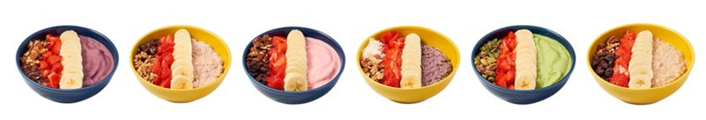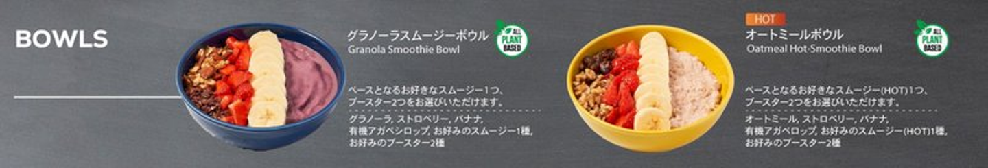 他にも「ストロベリーバナナ」「ブルーベリーモーニング」などの人気スムージーメニューを選んで自分だけのカスタマイズボウルがつくれます。