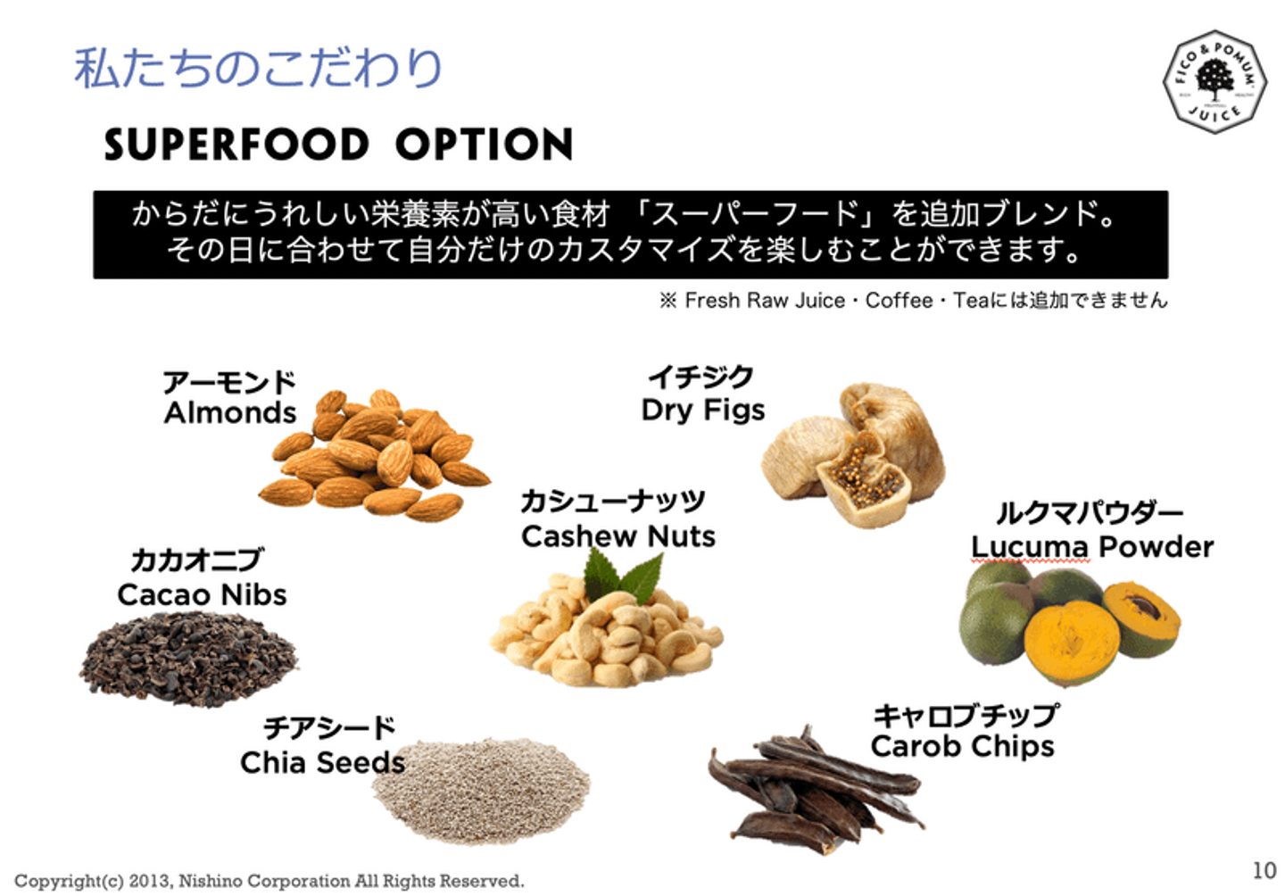 スーパーフードをはじめ、「スムージーにオプションを追加できる」という提案を、私たちF&Pは2013年の創業時からやっています。