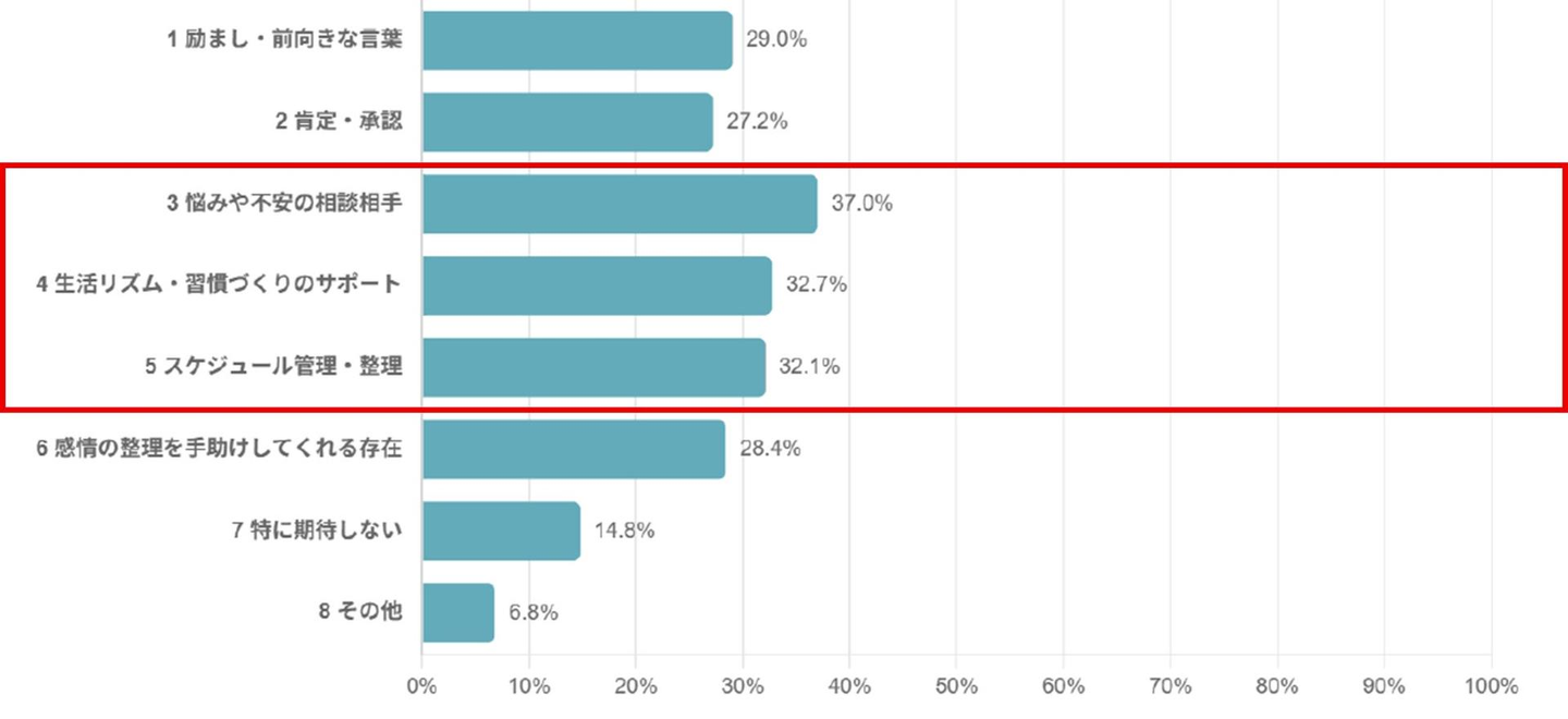 AIに期待する役割として、「相談相手」(37.0%)や「習慣づくりのサポート」(32.7%)が上位となりました。感情面への寄り添いを求める声も3割前後にのぼり、管理だけでなく“伴走的な支援”への期待が見られます。