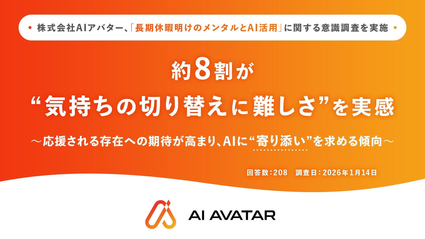 努力するあなたの“絶対的な応援団”を掲げる株式会社AIアバター(本社:東京都千代田区、代表取締役:加藤一郎、以下「当社」)は、全国の20~50代男女208名を対象に「長期休暇明けのメンタルとAI活用」に関する意識調査を実施しました。