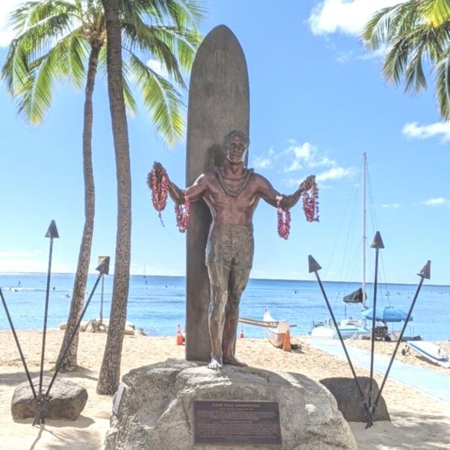 ワイキキのシンボル、メインストリートのカラカウア大通りにある「デュークカハナモク像」
