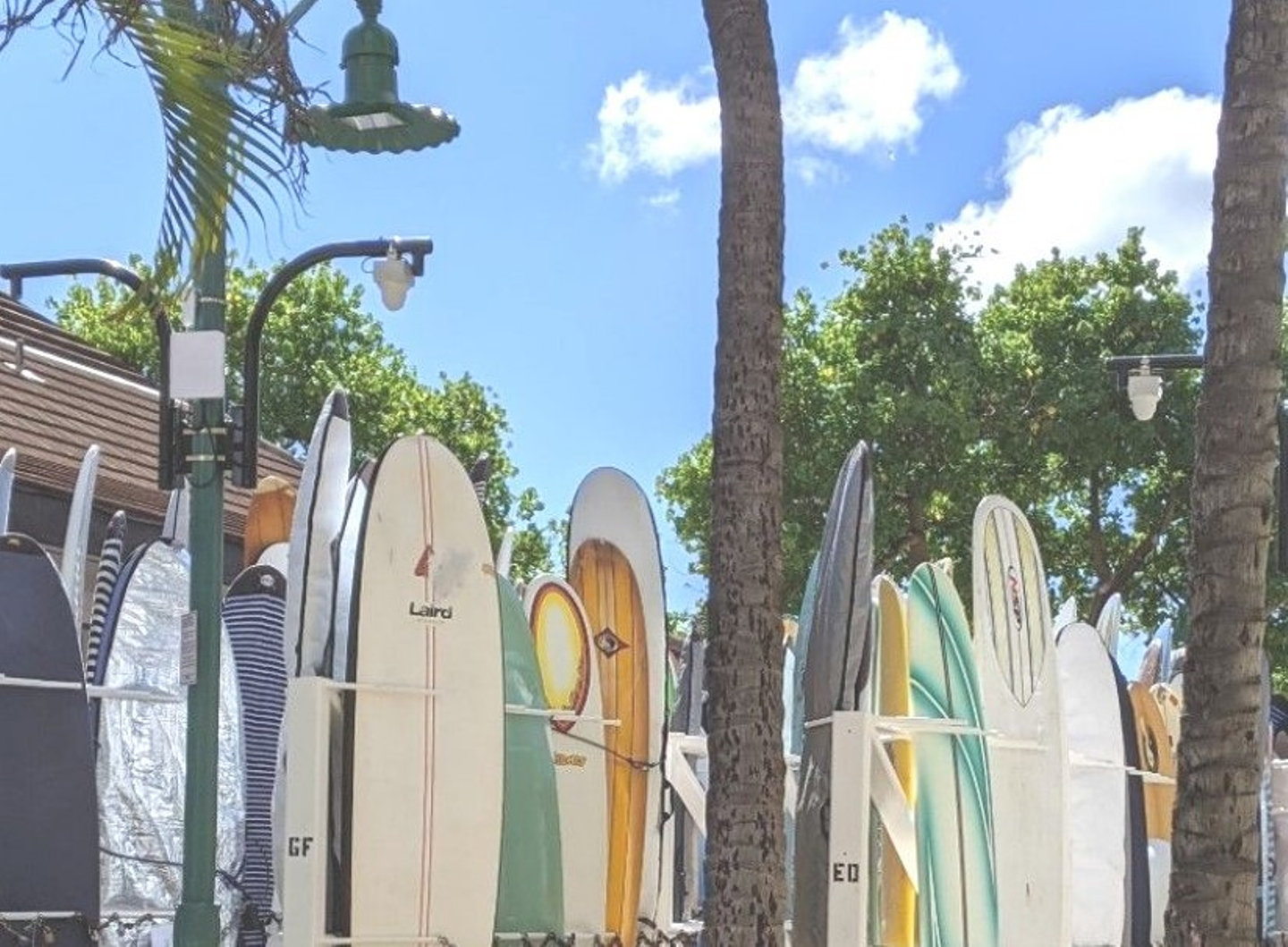 ワイキキビーチの西側にある交番裏のサーフボードラックは2020年2月の放火で500本以上のサーフボートが焼失しました。