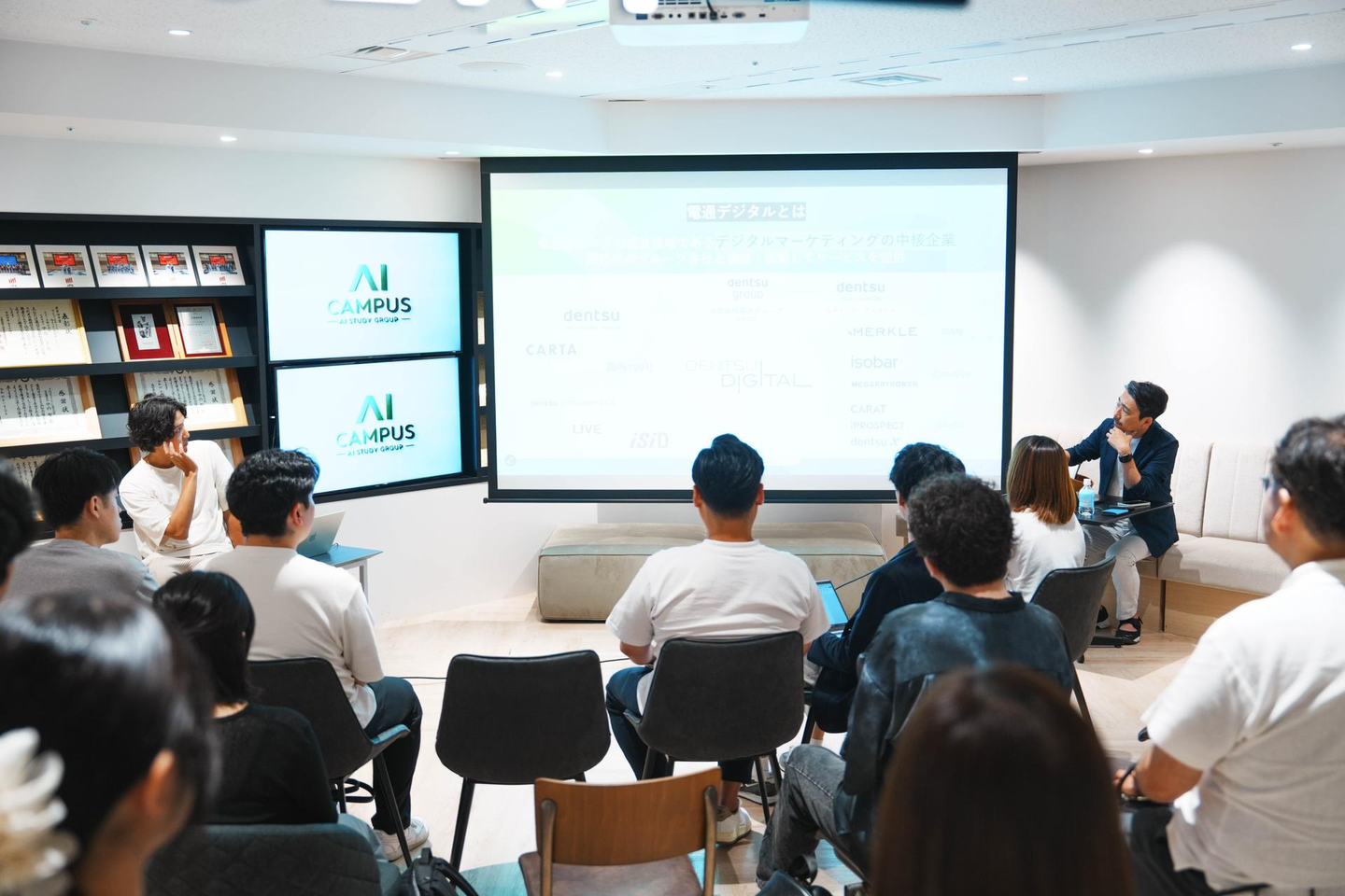 株式会社電通デジタルの山田健執行役員。外部講師としてご登壇いただきました!2025年5月よりスタートした『AIキャンパス』は、毎月開催し続け、今回で第3回を迎えました。AIという言葉が日常的に語られるようになった今こそ、私たちは“学びを共有し、未来を共に描く場”として、この取り組みを進めています。今後もAIに関する最先端のテーマを、技術的な切り口からビジネスへの応用、そして働き方の変革に至るまで、さまざまな角度からお届けしてまいります。「少しでもAIに興味がある」「未来の働き方にワクワクする」――そんな方は、ぜひ当社のストーリー更新を楽しみにしていてください!