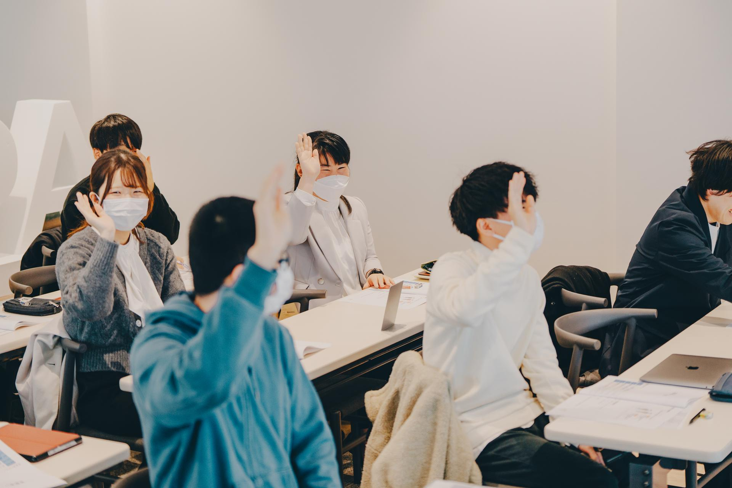 この研修では『社会人の基礎となるビジネスマナー』を学んでいきました。ビジネスマナーを学ぶ目的から勉強し『社会人と学生の違い』『正しい敬語の使い方』『ビジネスメール・電話』『名刺交換』など内容は盛りだくさん!ケーススタディが多かったため、全員が主体的に発言する姿勢が見受けられました。