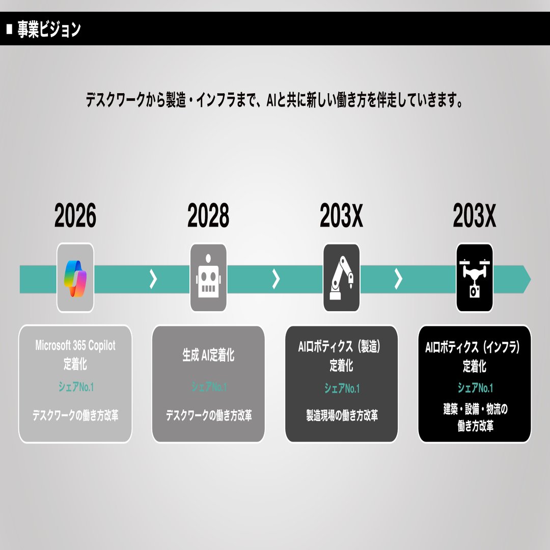 まずは2026年までにMicrosoftの生成AI/AIエージェントツールであるCopilotの定着化でシェアNo.1を獲る。 そして2028年までには、デスクワーク領域全体で生成AI定着化のシェアNo.1を獲りにいく。