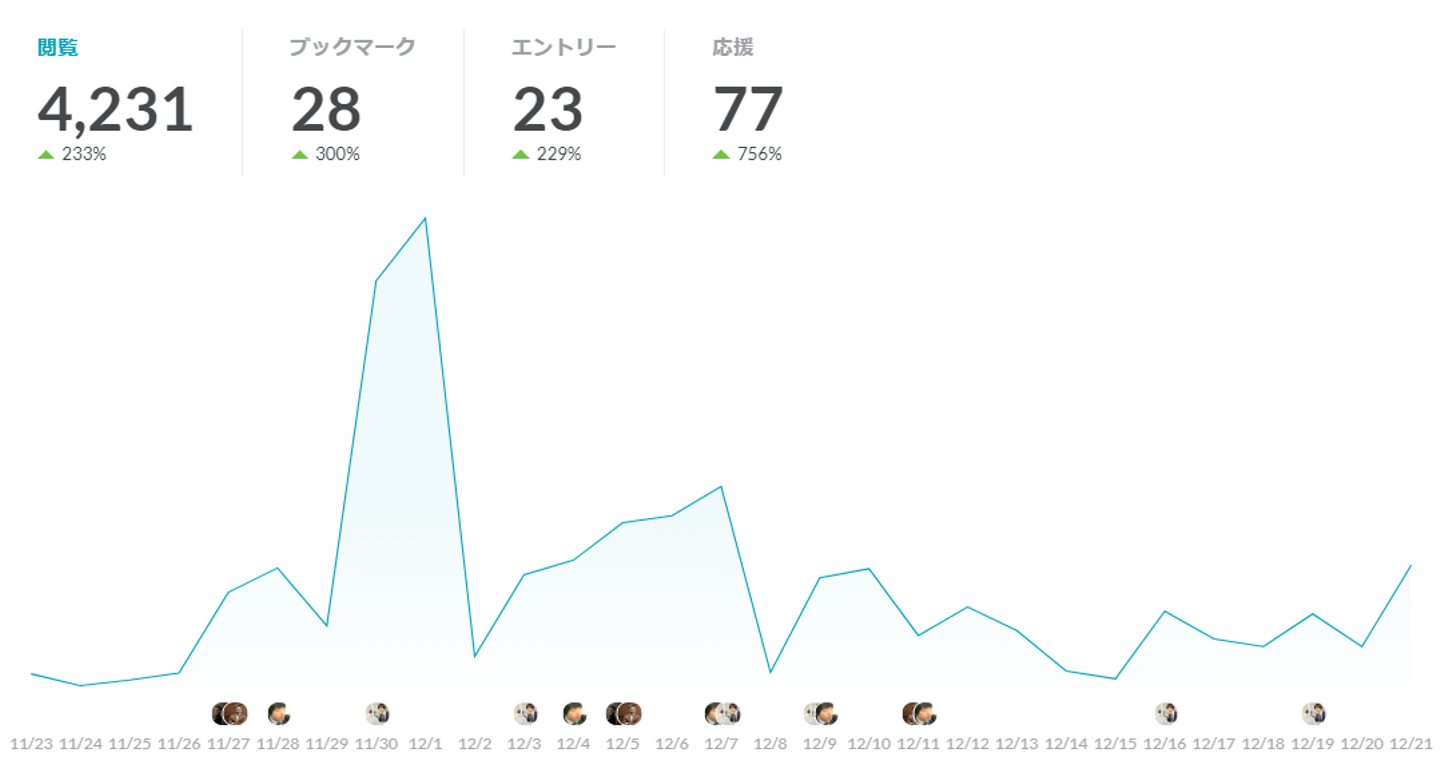 さらに、注目度ランキングは1000位以下だったのが、運用して約半月の12/7時点で