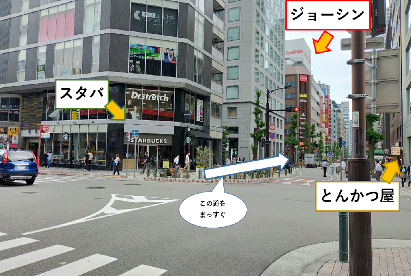 お花屋さんの横(お花屋さんが左側にある状態)をそのまま神戸国際会館に沿って進んでいくと、角にスタバのある大きな交差点に差し掛かります。スタバのある方に渡ってもらい、進行方向にジョーシンが見えている状態でまっすぐ進んでもらうと、(ちなみにこの時向かいにつっちー♪ が過去記事を載せたとんかつ屋さん、GYOZAバルがあります)