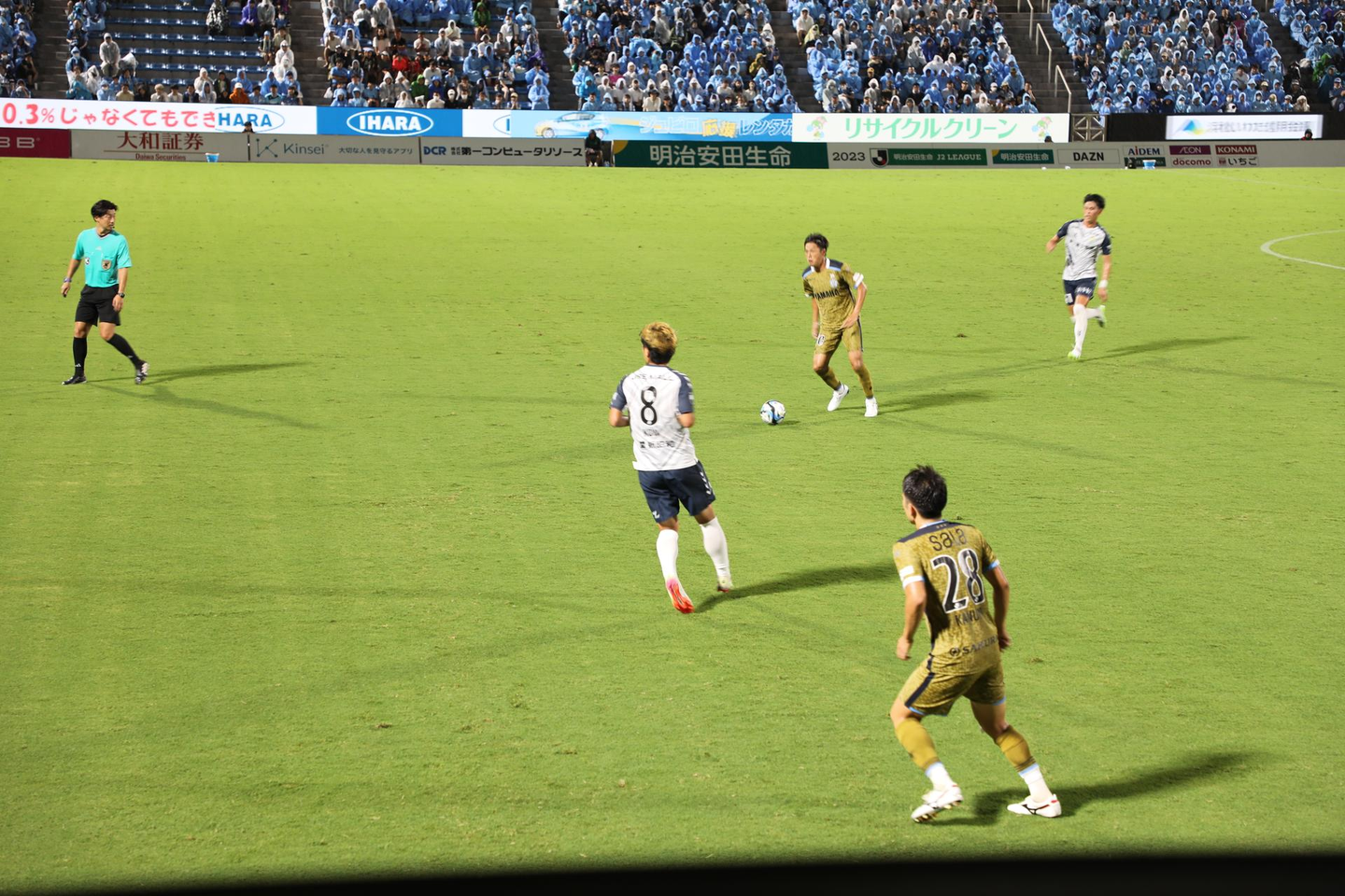 前半は千葉の猛攻で3点をとられピンチに。さらに運悪く激しい雷雨が降り始めたため、ハーフタイムで試合は一時中断。35分遅れて後半が始まりました。