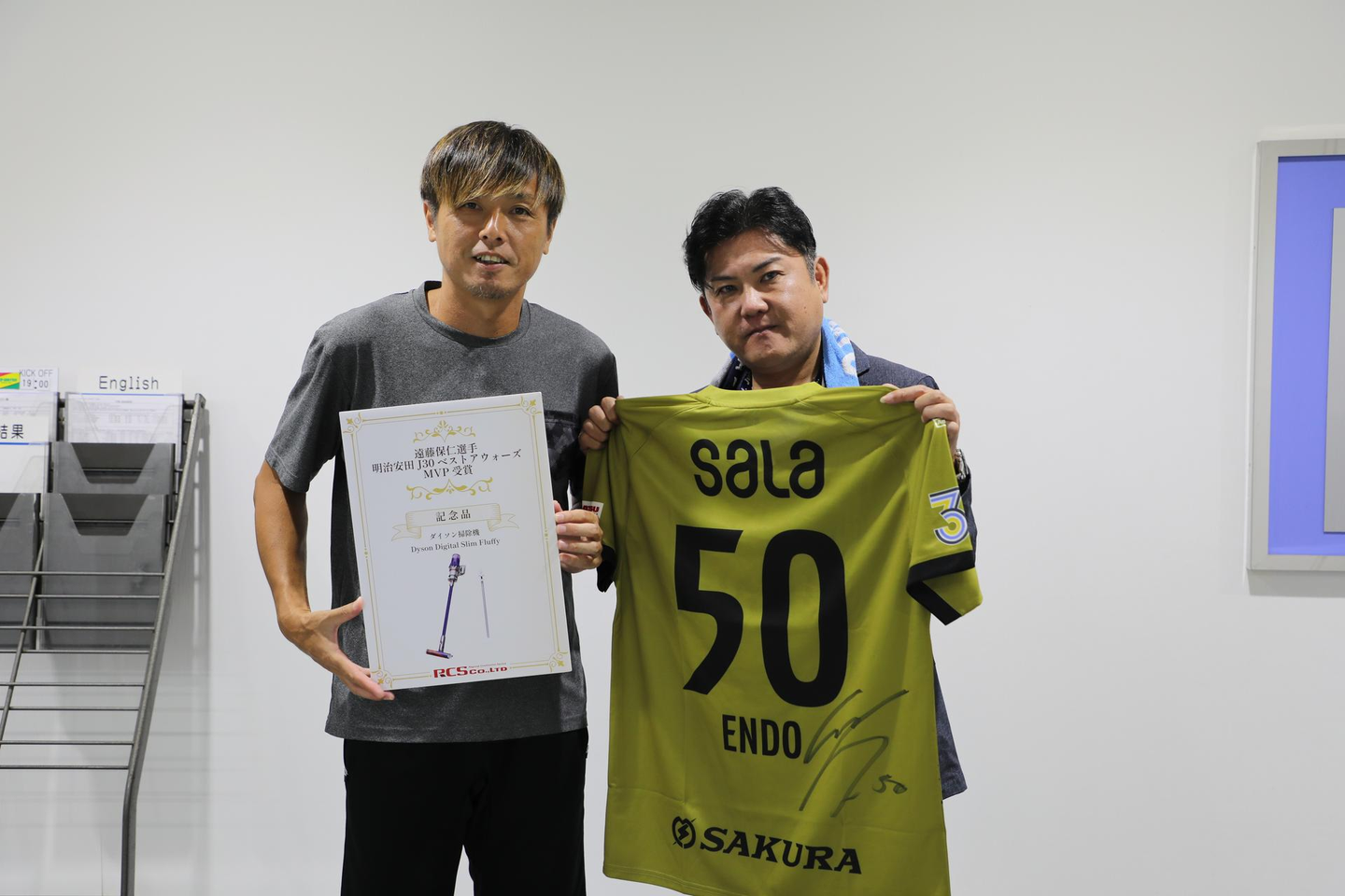 その後、少し遠藤選手のお時間をいただき、「明治安田J30ベストアウォーズ」MVPのお祝いをさせていただきました。