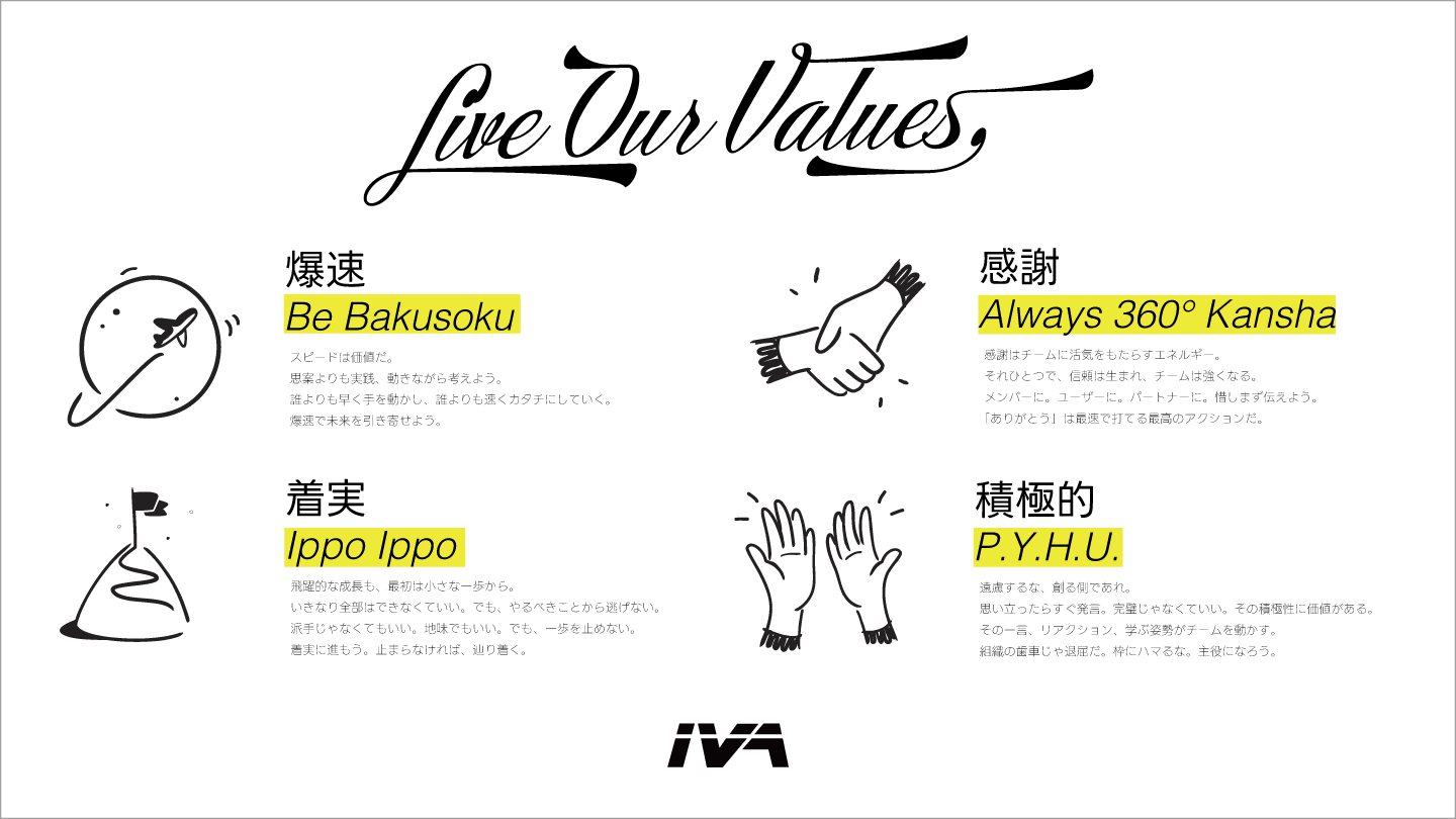 IVAではミッションである「AI × ヒトで、世界にもっと輝きを」と、ビジョン「80兆円市場をハックし、経済のポテンシャルを解放する」の実現に向けて、4つのバリュー(爆速・感謝・着実・積極的)を新たに定めました。それらは単なるスローガンではなく、メンバー一人ひとりの行動指針として根づかせていくものです。