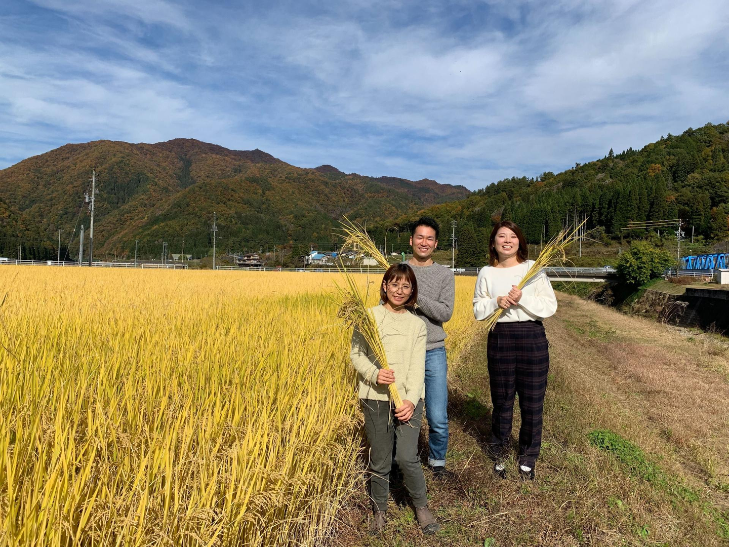 <お米農家さんとヒダカラスタッフ。実際に田んぼに出向いて打ち合わせしました!>