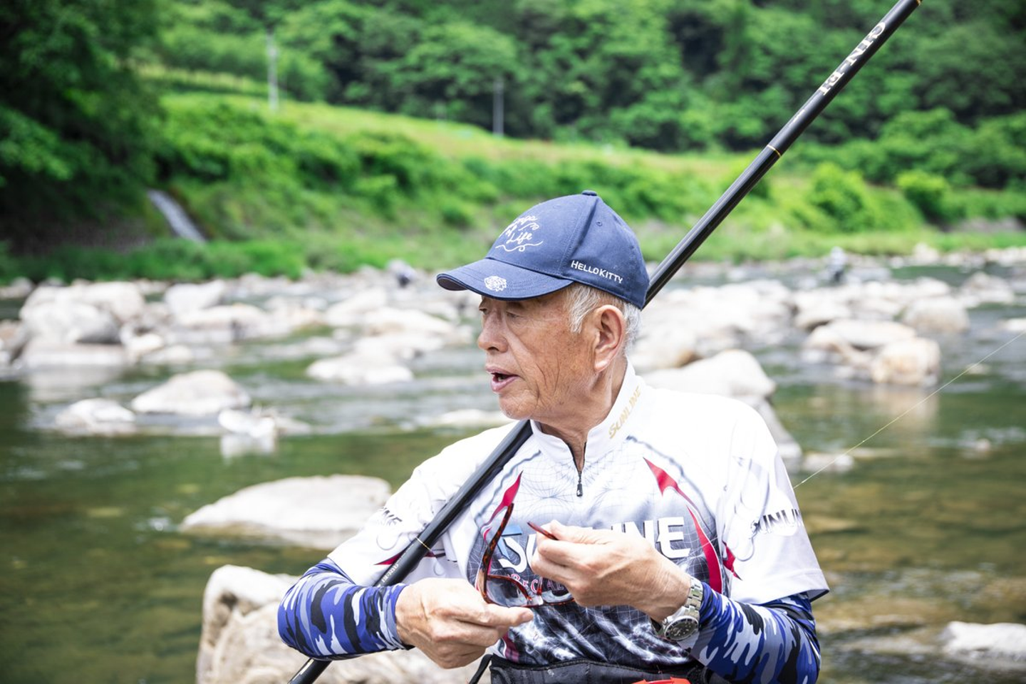 室田名人はスパイラル釣法で一世を風靡した、鮎釣リ界隈で知らない人はいないほどの有名人。全国プロ協会のオールスター大会優勝。大手釣リ具メーカーとスポンサー契約し、自身のモデル竿をプロデュースするなど、全国にファンクラブ会員が1000人以上ーもいたレジェンド釣リ師。全国の川を転々とし、宮川の鮎に魅せられ飛騨市に移住。関西•関東の高級料亭へ鮎を卸すなど、プロの料理人からの信頼も厚い。