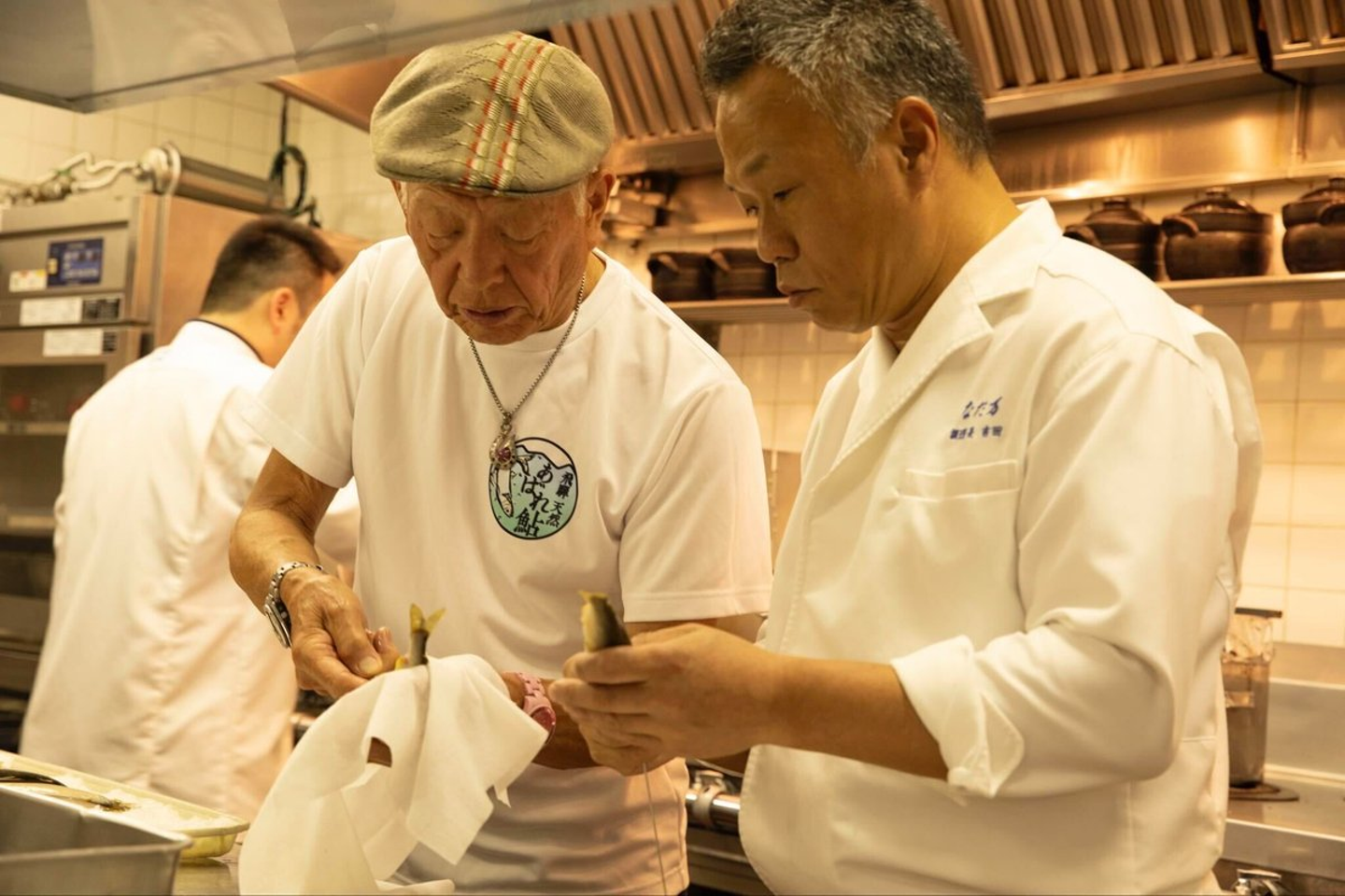 なだ万、新宿店で吉田料理長に鮎の扱いを伝える室田名人