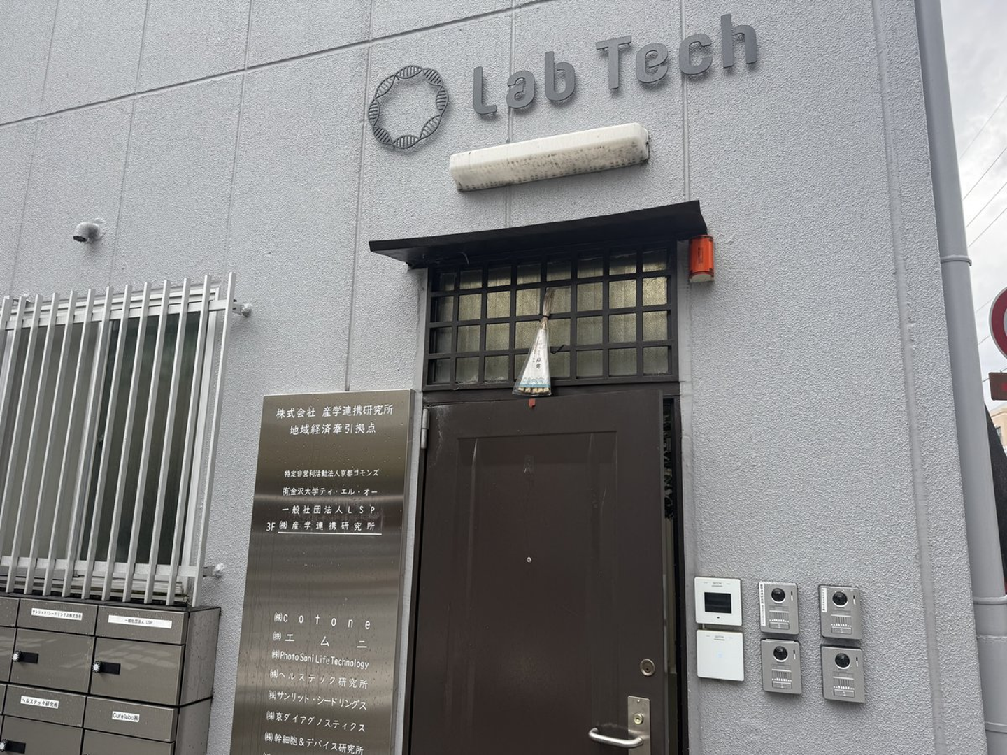 入口上部にLab Techと書かれたグレーのビルが、エムニの京都オフィスがある地域経済牽引拠点ビルです。