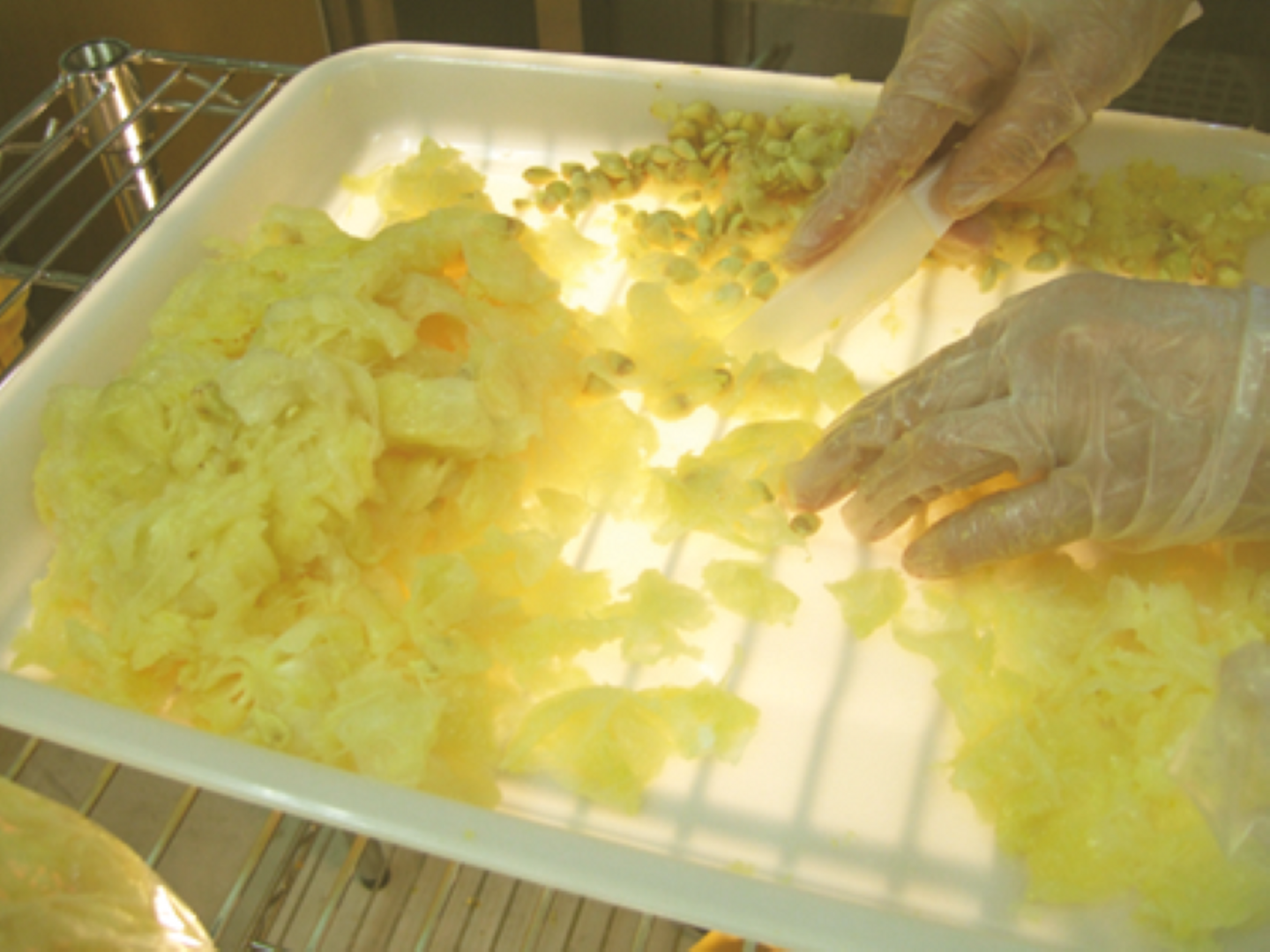 こちらも手作業で内部の種を一つ一つ丁寧に取り除きます。
