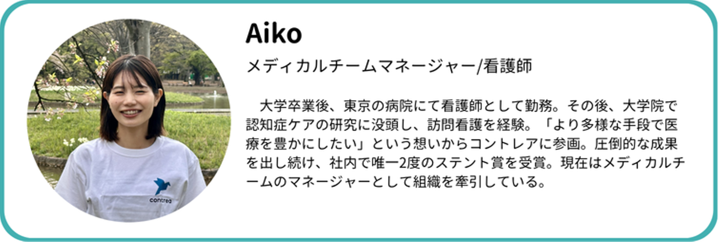 コントレアメンバー一人ひとりの歩みを紐解くインタビュー連載。第4回は、看護師として臨床を経験し、大学院での研究を経てビジネスの世界へ。現在、Medicalチームのマネージャーを務め、社内で唯一2度のステント賞を受賞したAikoさんです。