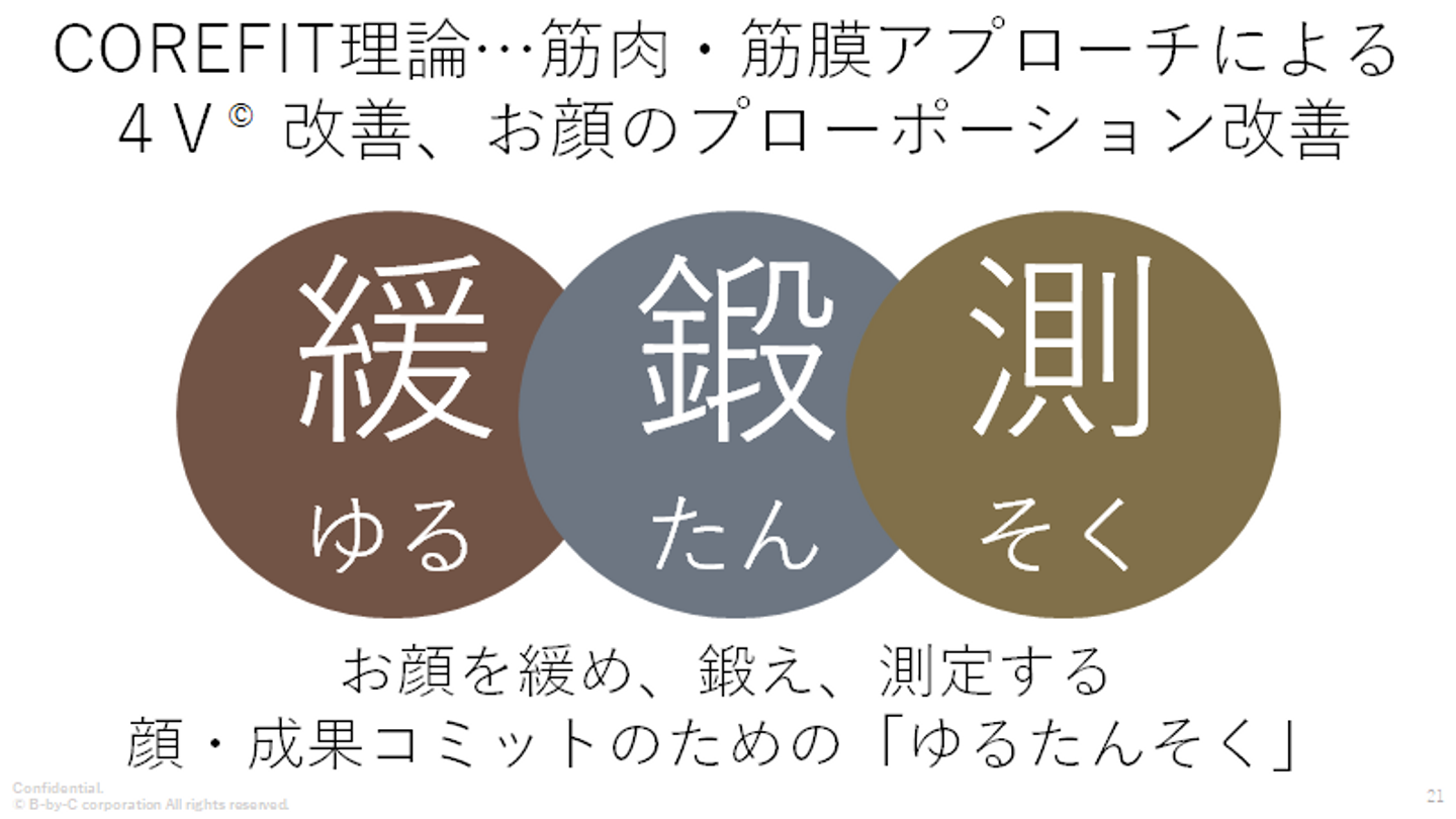 ゆるたんそく理論とは、まず、緩める、鍛える、そして測るを繰り返すことで、お顔をが変わる理論になっております。