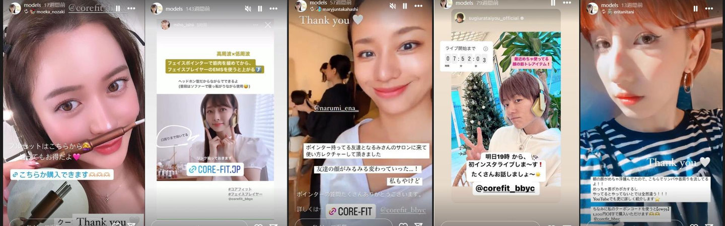 基本的には、①を中心に業務を進めておりまして、メンバーは担当のインフルエンサーさんとやりとりをしながら、COREFITがいかにSNS上で魅力的に表現されるかを試行錯誤しています。インフルエンサーさんにはCOREFITで顔が変わった!と思っていただくのがイチバンなので、直接お会いして体験をしたり、集まっていただいて懇親会のようなことを行っています。