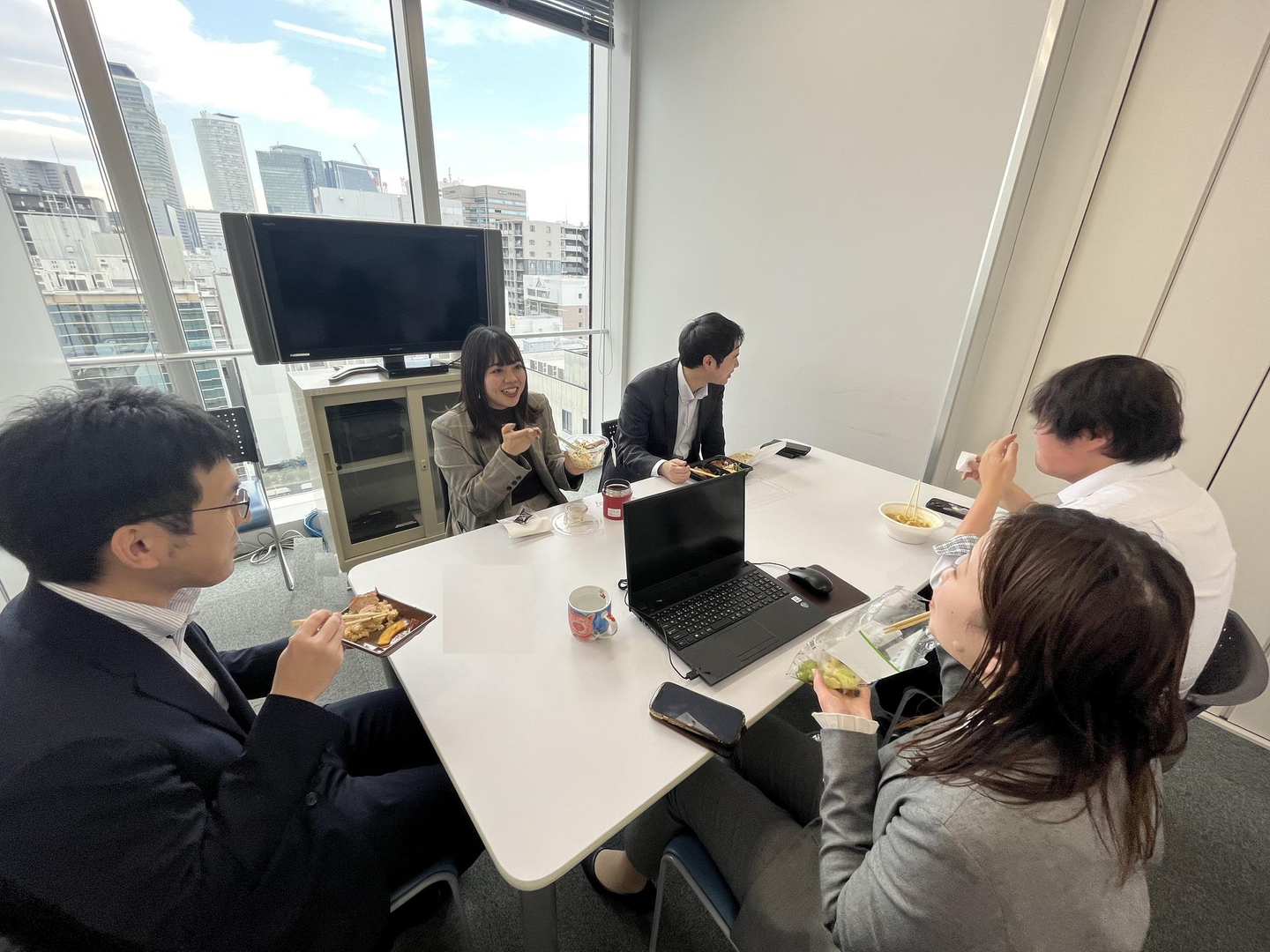 基本的には社内で話しながらお昼を食べたり、外へ食べに行ったり。 時にはお客様に誘ってもらい昼食を一緒に食べに行くこともあります。