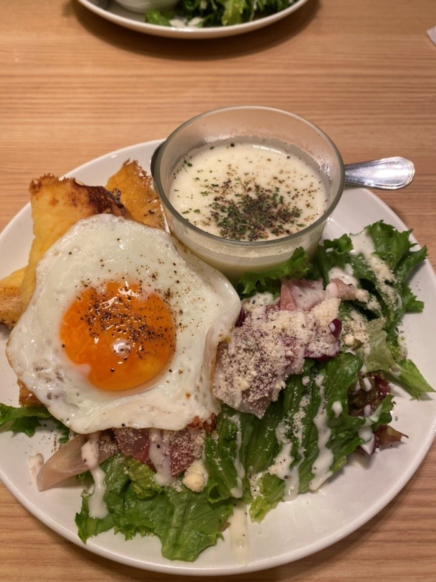 シーザーサラダ、目玉焼き、フレンチトースト、冷静コーンスープで