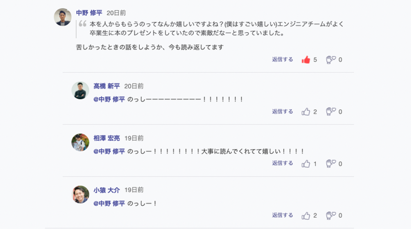 移転パーティーなど飲み会に呼んでもらってます。また、ourly立ち上げ時に一緒にインターンをしていたメンバー(そのうち3人が ourly に新卒入社)とはよく飲みに行きます。