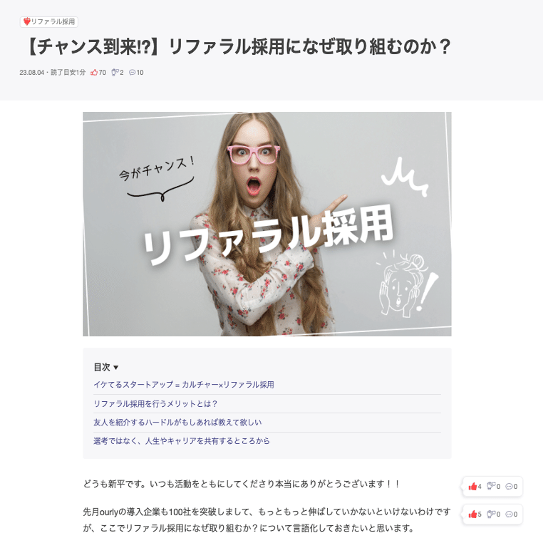 読んだ社員が「自分もリファラルやってみよう!」と思えるように、ハードルを下げる発信を心がけています。