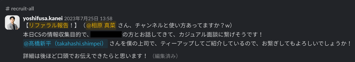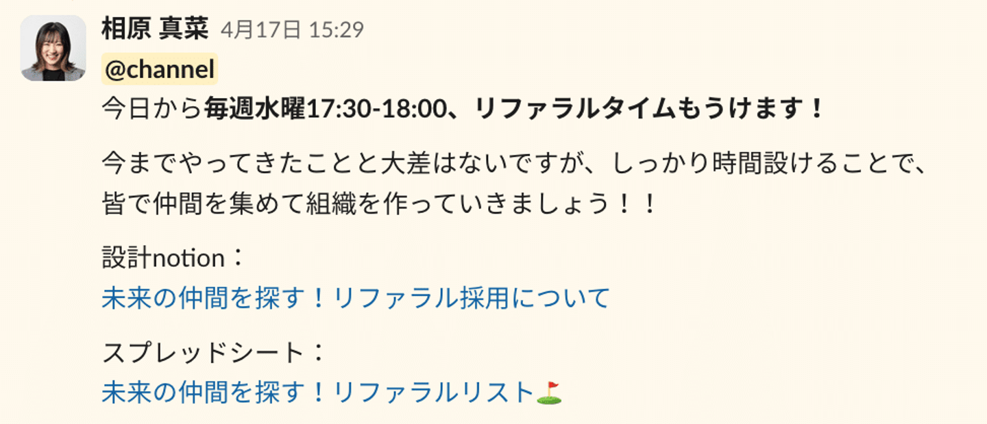 リファラルが生まれた時は、#recruit-allという全社員参加のチャンネルにて「リファラル報告!」をしてもらいます。
