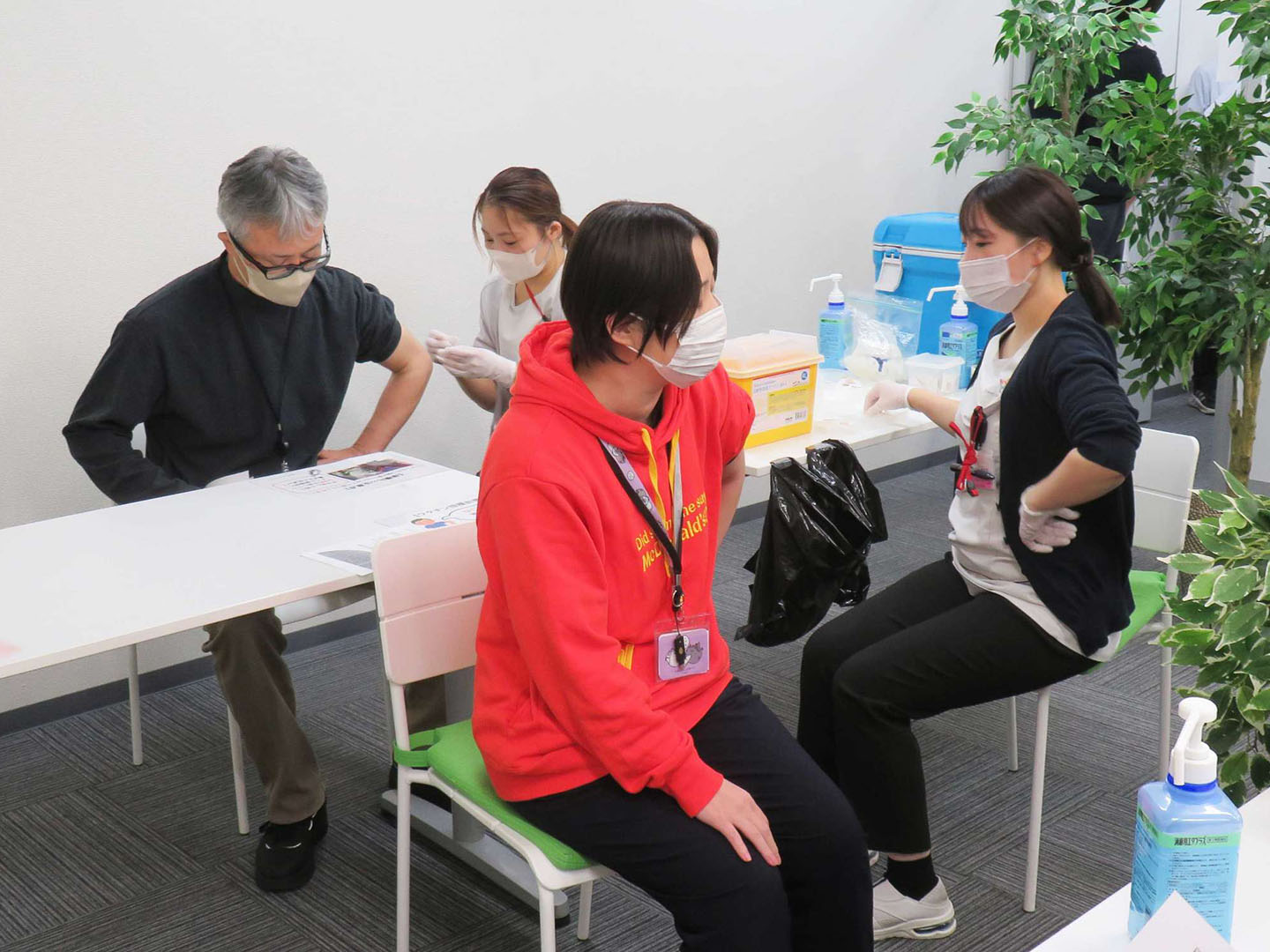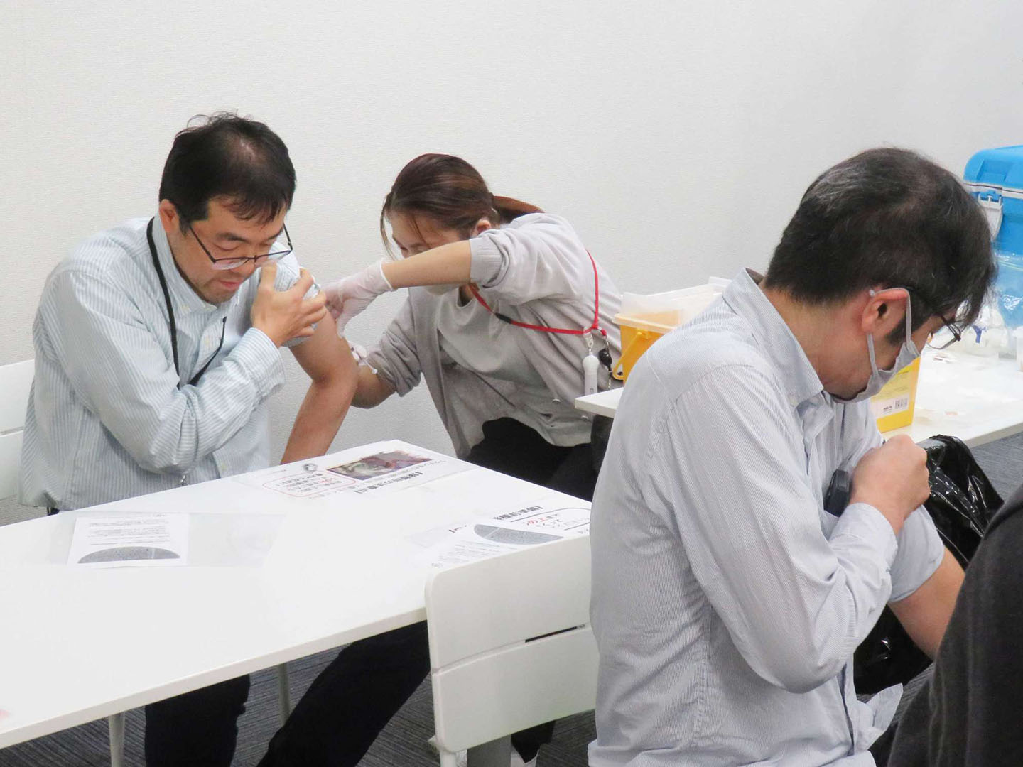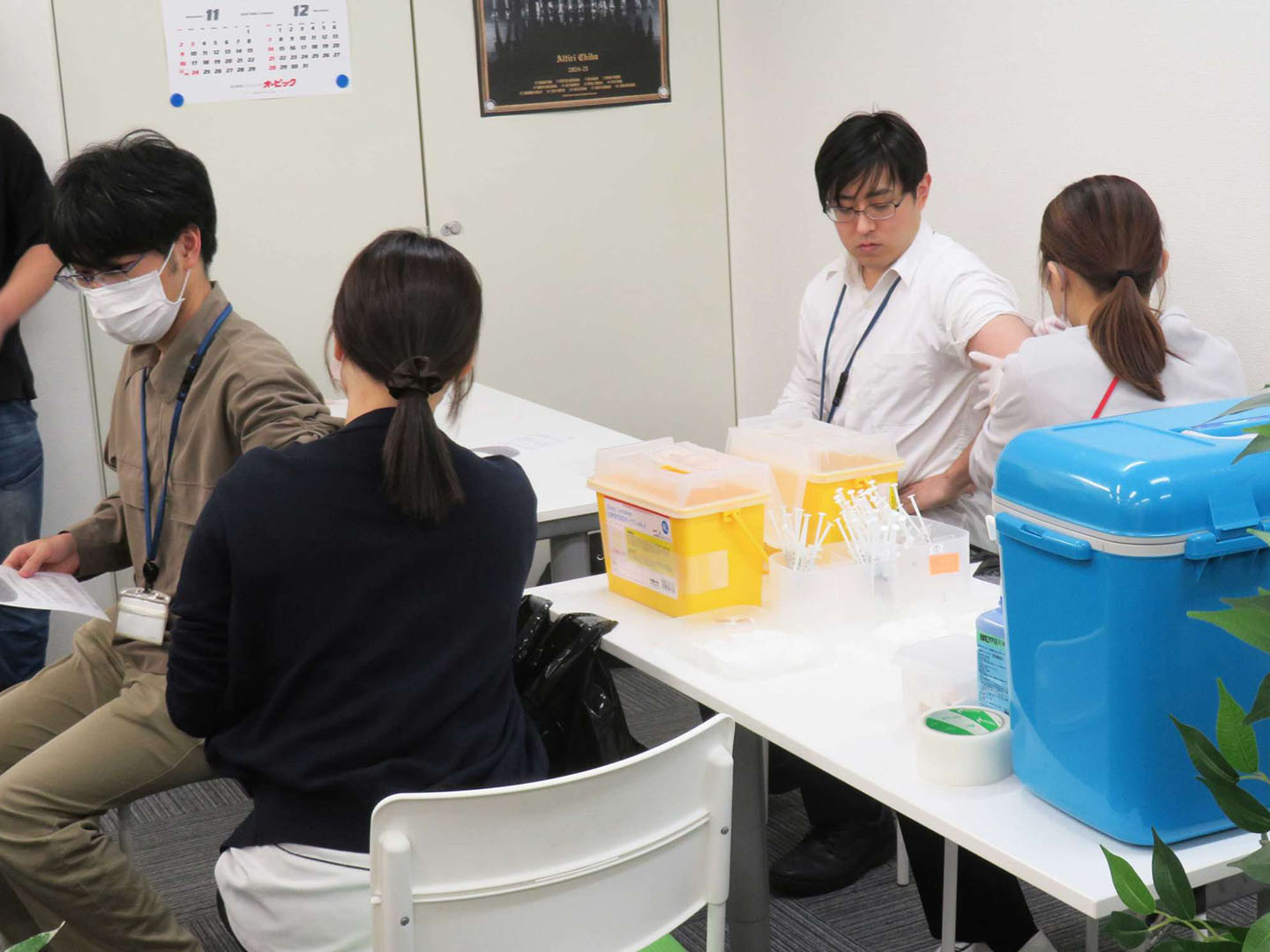 予防接種は勤務時間内に行われたので、各自仕事の合間をぬって受付をします。続々と社員が集まってまいりました。