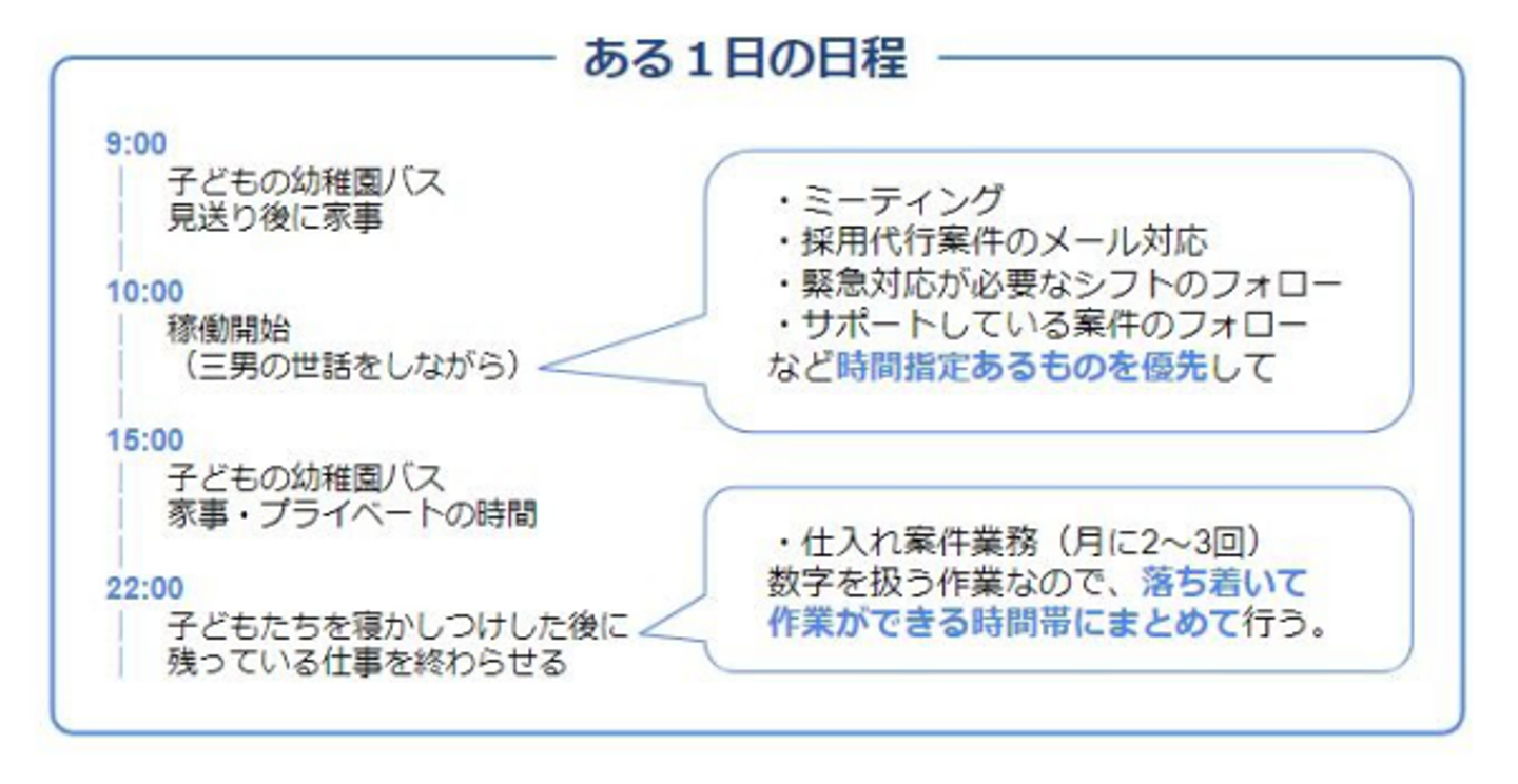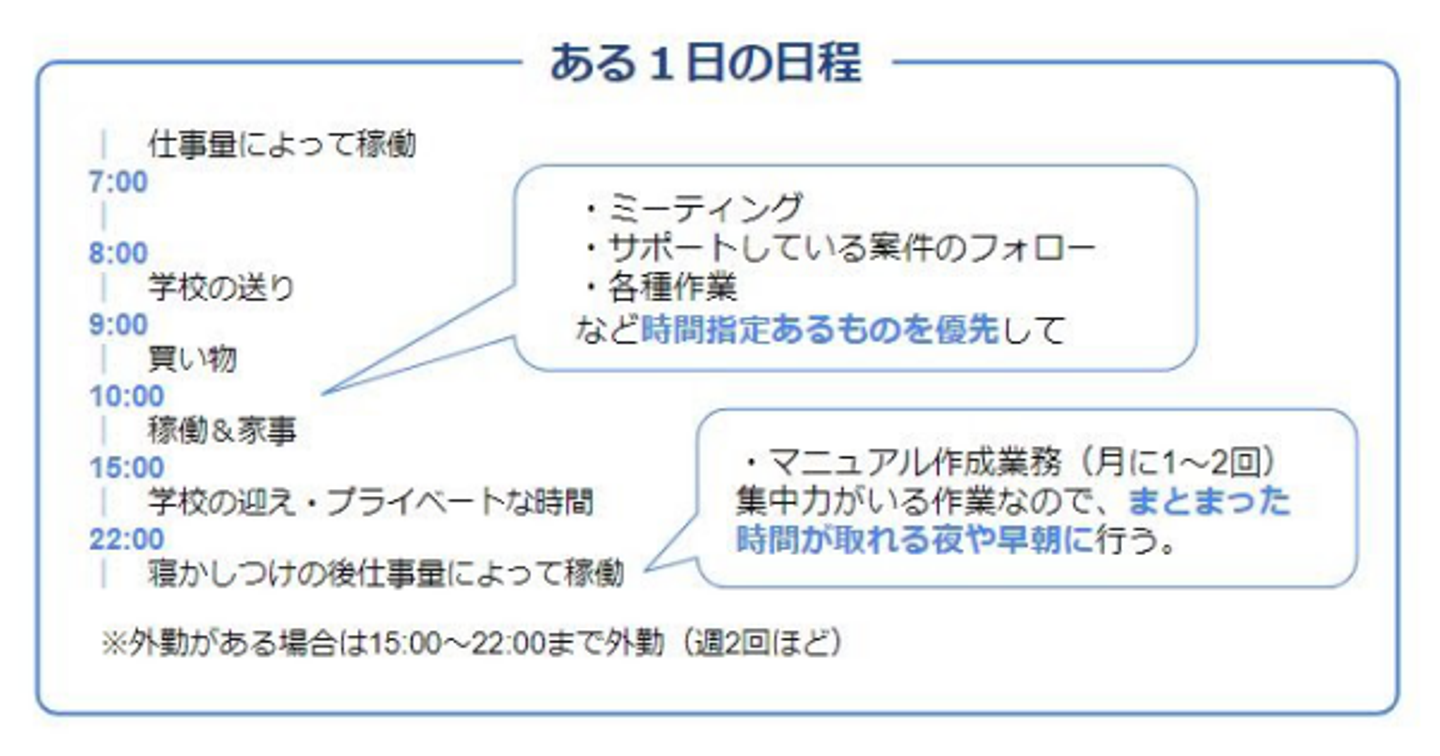 私が行っている採用代行業務は、平日午前に必ず作業がありますが、業務時間が午前中と幅があり業務量も多くないため、子どもの様子を見ながらこなします。家を空ける用事でどうしてもシフトに入れない場合は、案件のサポートさんに代行してもらうこともあります。