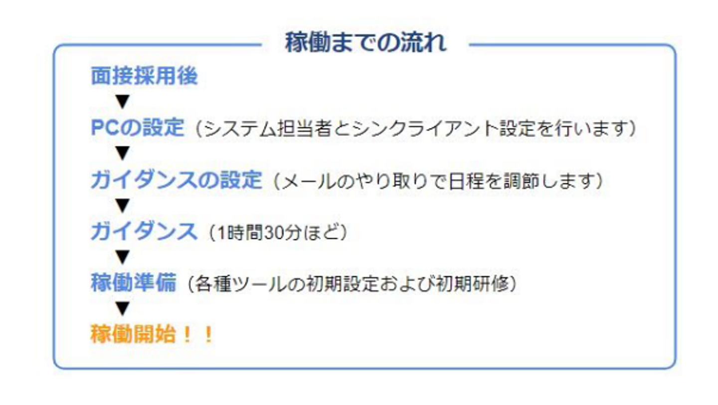 初期設定や初期研修が終わり、ガイダンス担当者に完了報告が済めば、すぐに稼働を始められます。