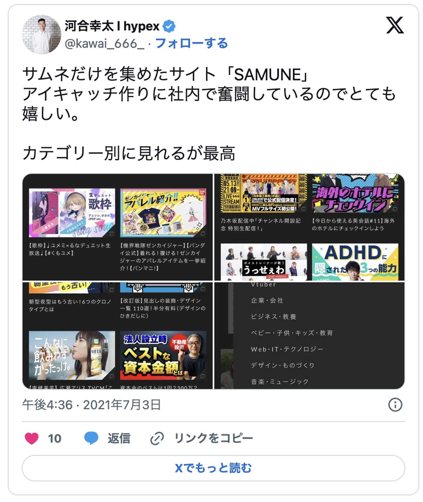 名前の通り、サムネイルだけが集められたサイトです。どちらかというとYouTubeとかのような動画のサムネが多い印象です。ただ、YouTubeって人が出ているサムネが多くクオリティも高いので、採用インタビューや採用広報記事などのアイキャッチにも実際とても参考になります。