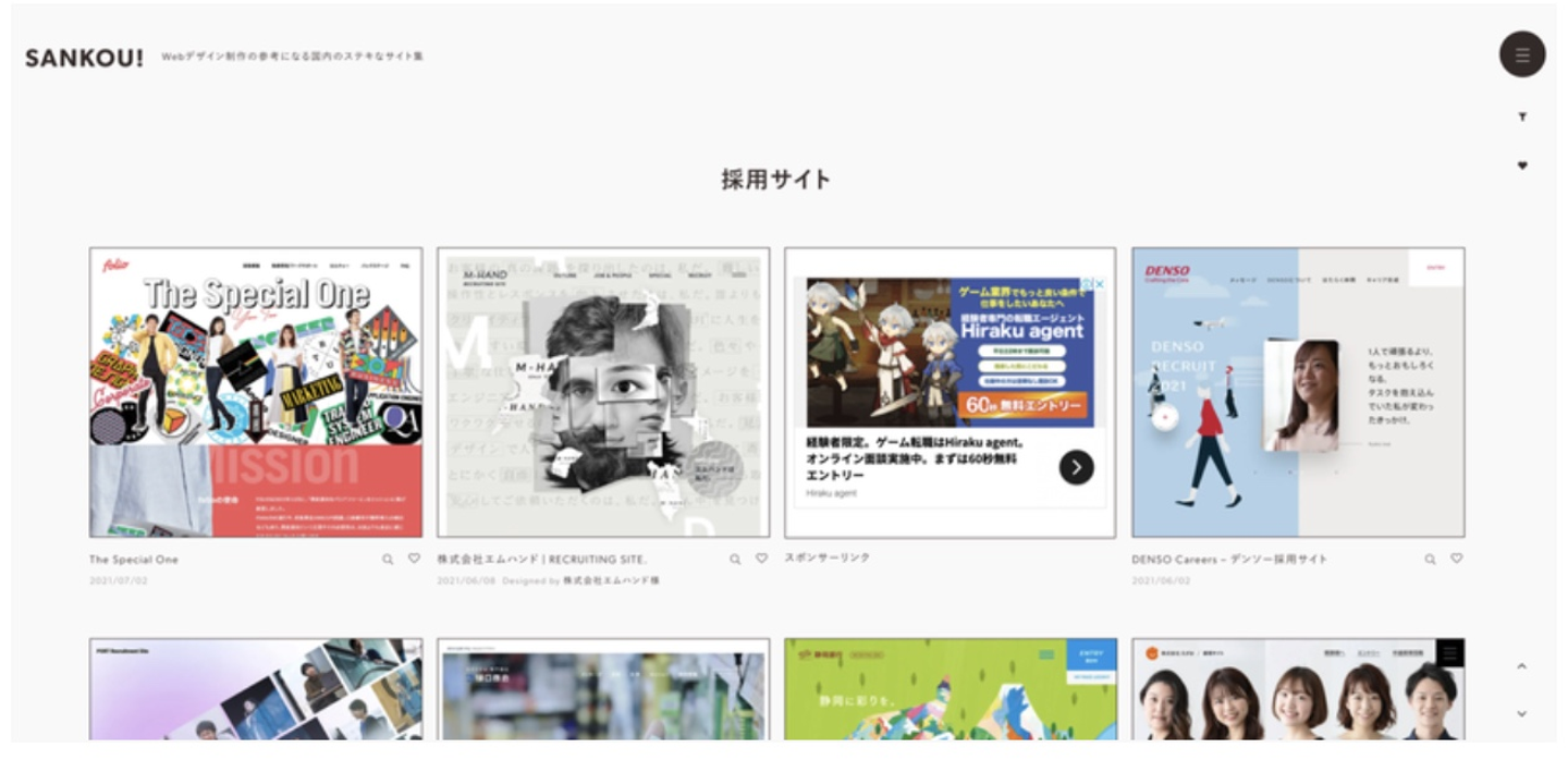 SANKOU!は採用サイトの事例などを探す際に役立ちます。サイト自体は、採用に特化していないので、色々あるのですが、他サイトとは違いカテゴリー検索などできるので探しやすくて気に入っています。